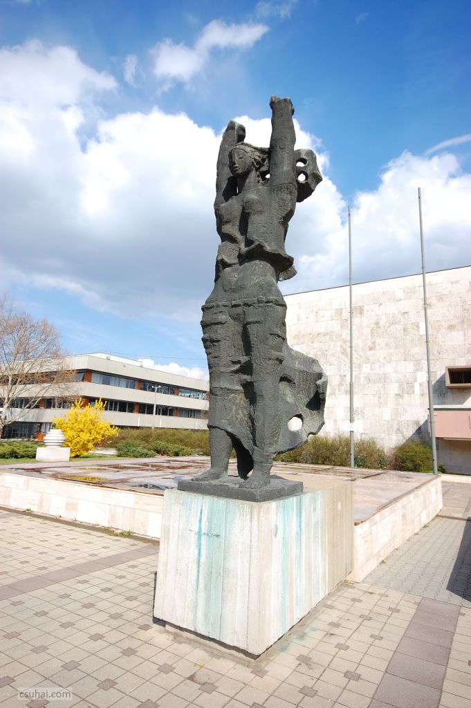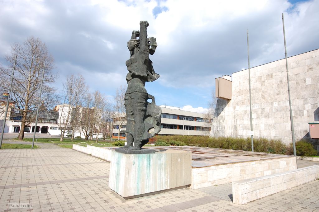 a Géniusz, új helyén megfosztva ugyan jelentésbővítő eredeti kísérő architektúrájától, de monumentális mesterséges térben, a városi sportcsarnok előtt,