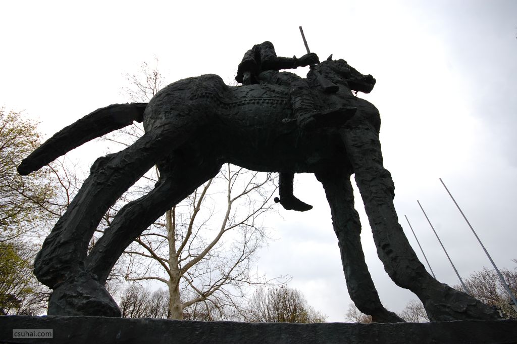 Úgyhogy azonnal a merevlemezemhez folyamodtam, hogy próbát tegyek néhány budai lovasszoborral, olyanokkal, ahol a ló mind a négy lába érinti a talajt. Görgey Artúr egyik lovasszobrán (a fenti, ifj. Vastagh György által 1935-ben készített eredeti szobron, és a lenti, Marton László által az eredetiről készült képek és a fennmaradt kisminta alapján mintázott 1998-as változaton)