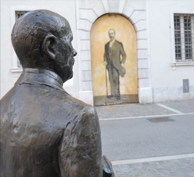 melyre sokirányú internetes kirándulásaim során bukkantam. Egyszerre kalapos és könyvet tartó szobor (hogy olvasó vagy író, egyre megy). Ez nekem kell. Soha életemben nem jártam Triesztben, úgyhogy ezúttal nem a saját tollaimmal ékeskedem,