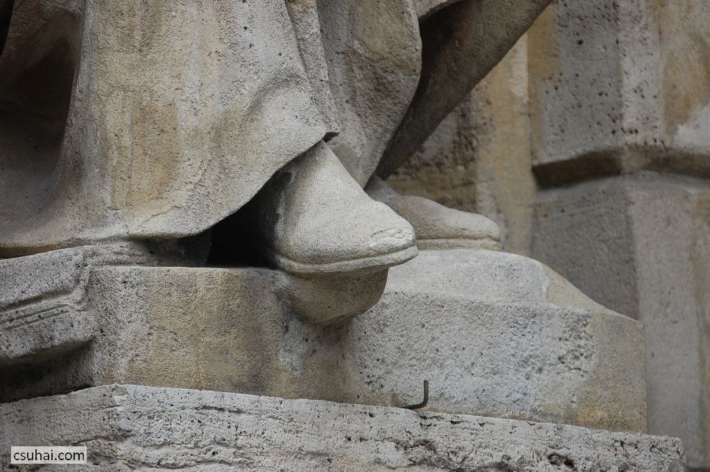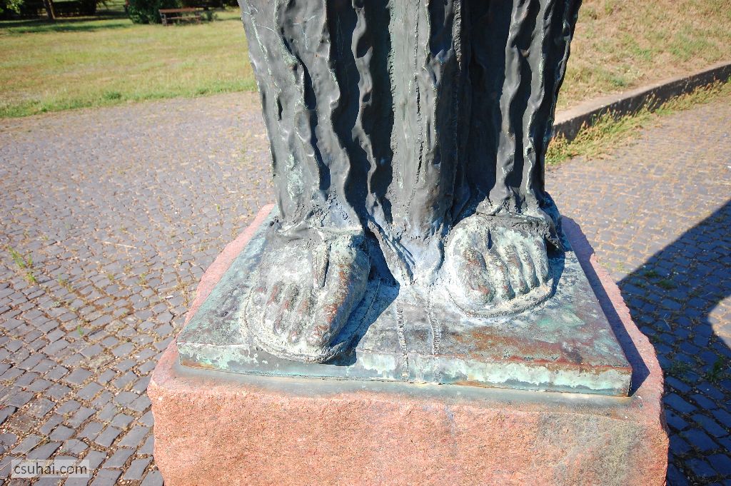 És meg sem tudom számolni, hányszor néztem már meg az emlékművet, sokszor fényképezés nélkül is, mikor észrevettem egy halványan érzékeltetett szobrászati konvenciót, a talapzatról a két keskenyebb oldalon lelógó emberi talpat,