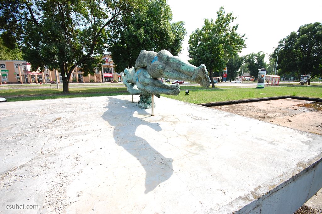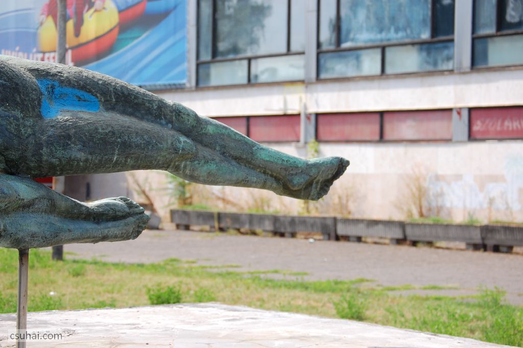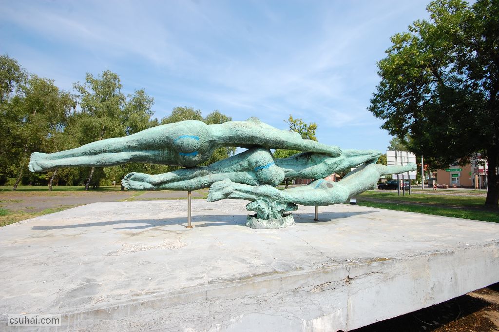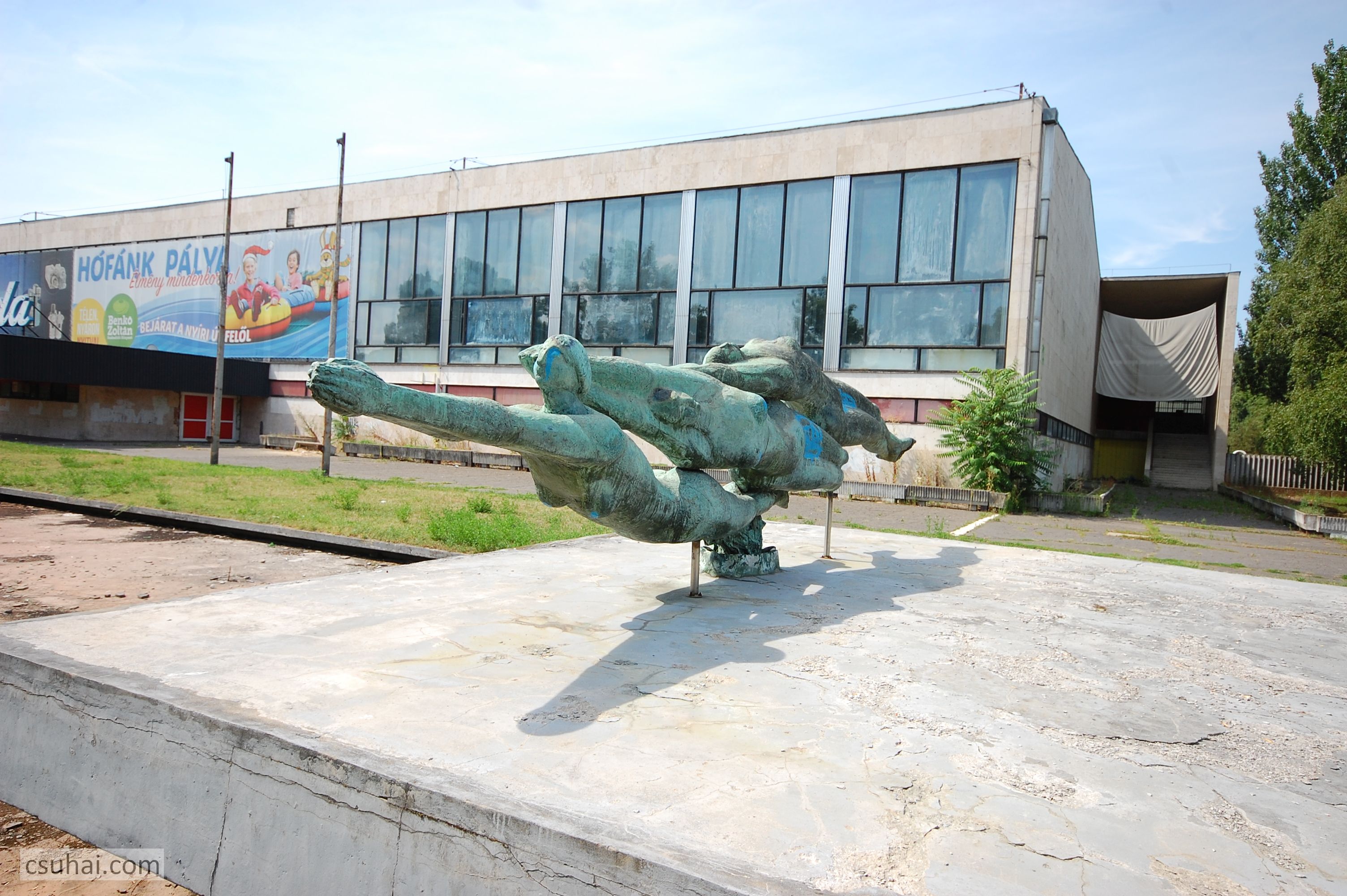 viszont felületét mostanra az újrapatinázók helyett a graffitis elmebetegek vették kezelésbe, és ugyanúgy az enyészet útjára lépett, mint a mögötte lévő, évek óta bezárt uszodaépület, amely nyilván valamilyen újundok, az EU-pályázatból a lehúzás után maradt pénzből felhúzott wellness-fürdőnek adta át a helyét. Pedig párját ritkító dolog, nem sok hozzá fogható szobor látható Magyarországon.