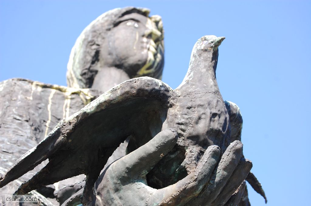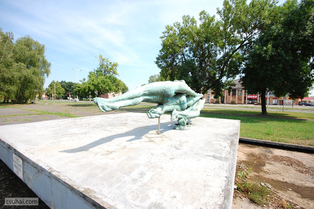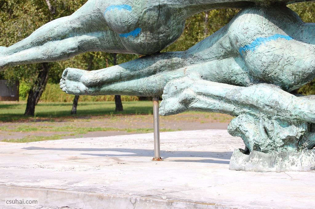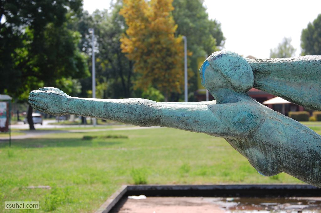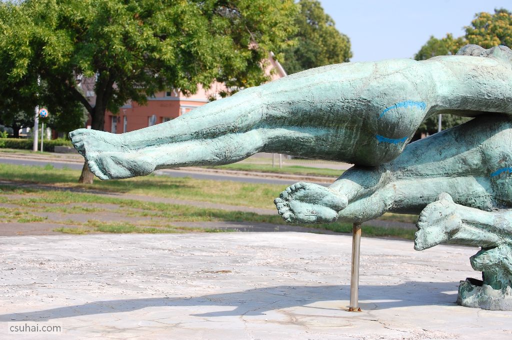 viszont felületét mostanra az újrapatinázók helyett a graffitis elmebetegek vették kezelésbe, és ugyanúgy az enyészet útjára lépett, mint a mögötte lévő, évek óta bezárt uszodaépület, amely nyilván valamilyen újundok, az EU-pályázatból a lehúzás után maradt pénzből felhúzott wellness-fürdőnek adta át a helyét. Pedig párját ritkító dolog, nem sok hozzá fogható szobor látható Magyarországon.