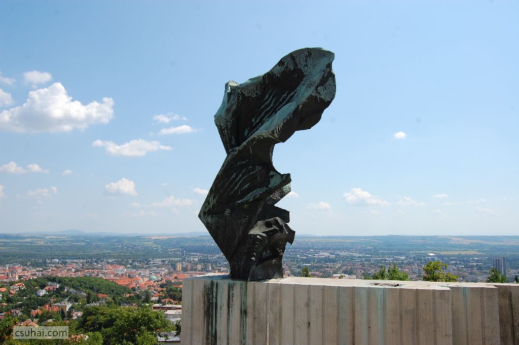 a Duna felől látható jól. (Ezt a képet nem is a Margitszigetről, hanem egy hajókirándulás során fényképeztem.) A tényleges szobor építészeti megoldása, a talapzat és az egész plasztika terét adó lépcsős kiképzés (mely a Mauthausenben álló