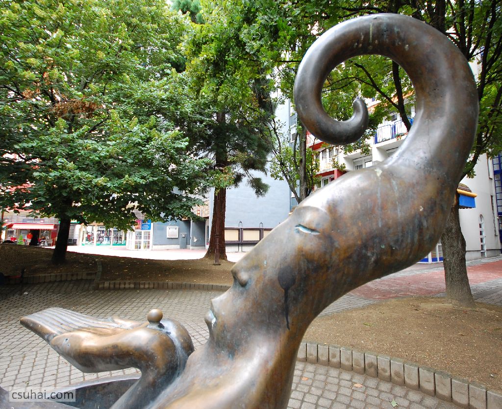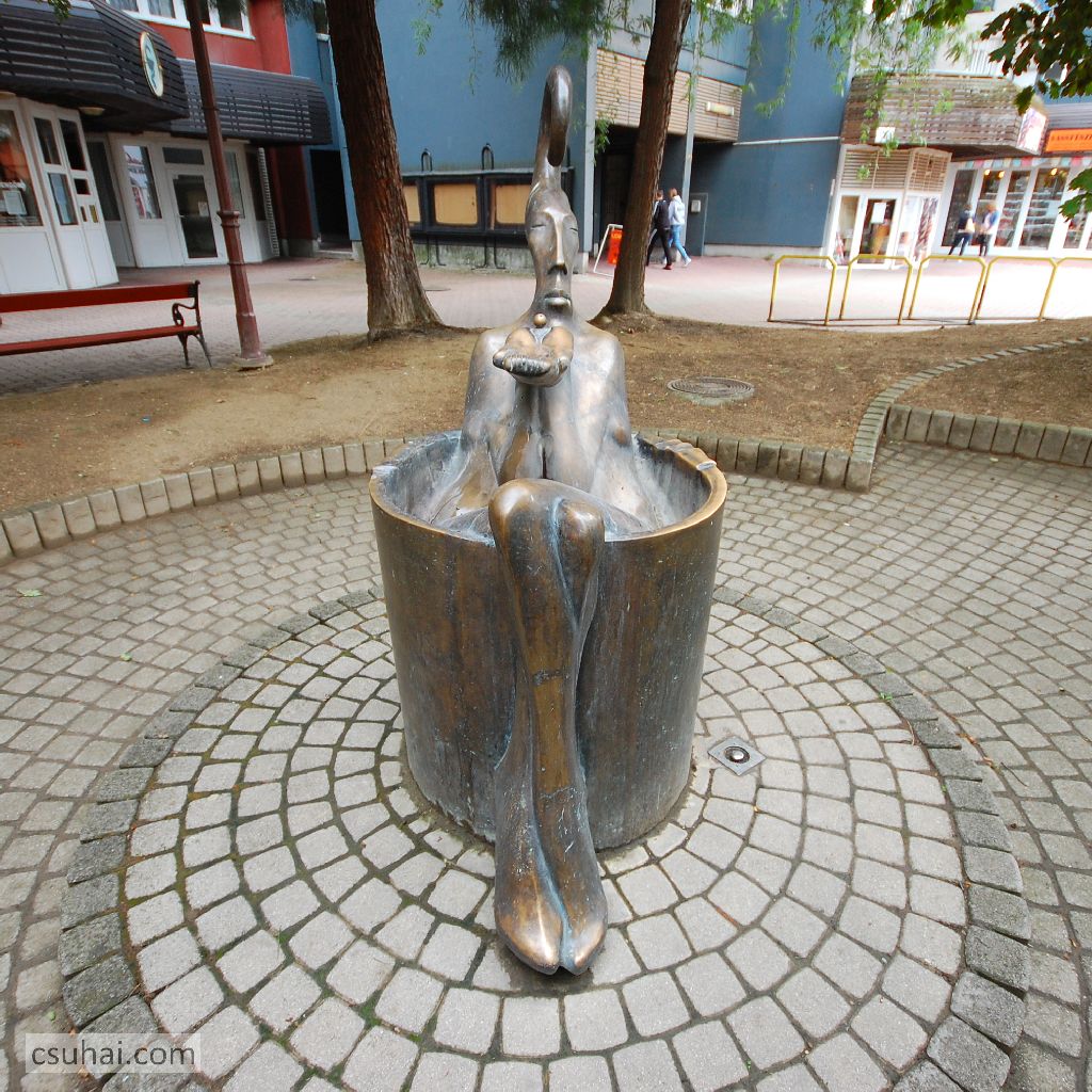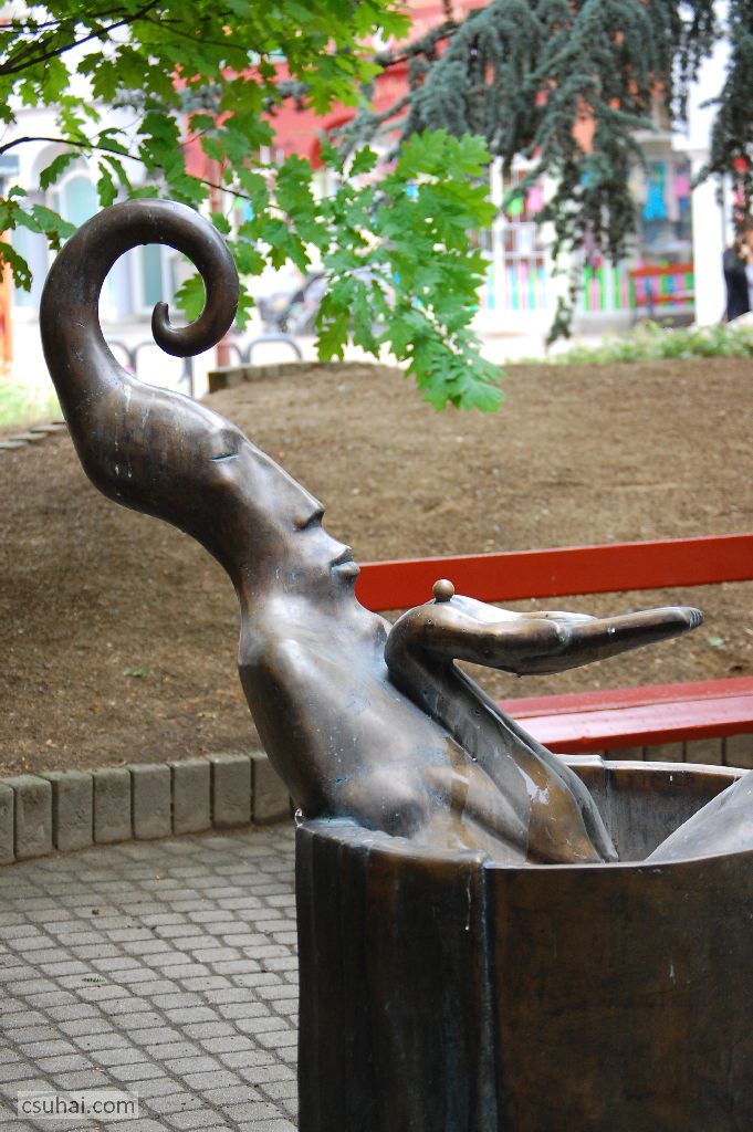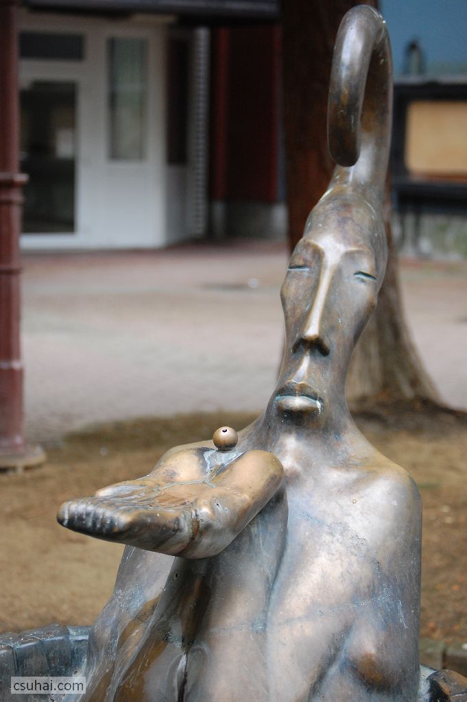 DSC_1379Fischer György Siklóson született, a pécsi képzőművészeti szakközépiskolában kezdte művészeti tanulmányait, a főiskolát 1977 és 81 között végezte el, ahol Somogyi József volt a mestere. A diploma után Zala megyében telepedett le, Zalaegerszegen nagy része volt abban, hogy az ottani Ady Endre Általános Iskola és Gimnázium tantervében a művészeti oktatás előtérbe került. Nem tartozott a felkapott budapesti elit világába, felállított szobrai kivétel nélkül választott megyéjének településein állnak. E bejegyzés főszereplője, a zalaegerszegi Európa téren (a panelházas egerszegi belváros egy kicsi parkjában) 1999-ben járókövekből kirakott köralakú kis posztamensre elhelyezett Ivókút című, életnagyságú szobra viszont rendkívüli dolog. A szobor önmagában testesíti meg, összegzi mindazokat a vonásokat, melyek egy modern köztéri díszítőszoborral kapcsolatban felmerülnek a kétezres években.