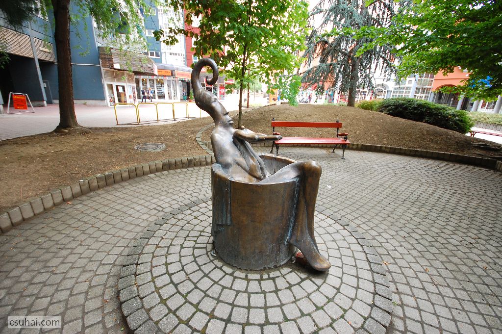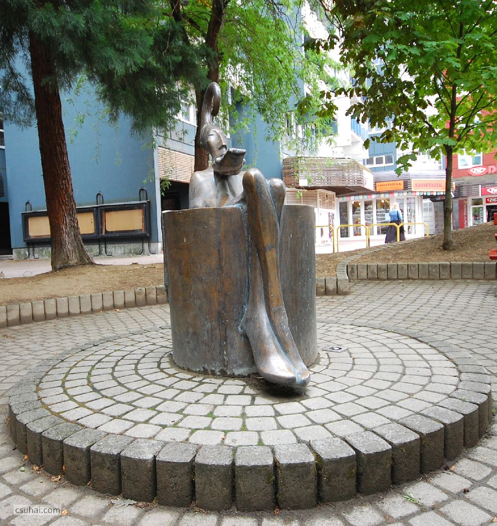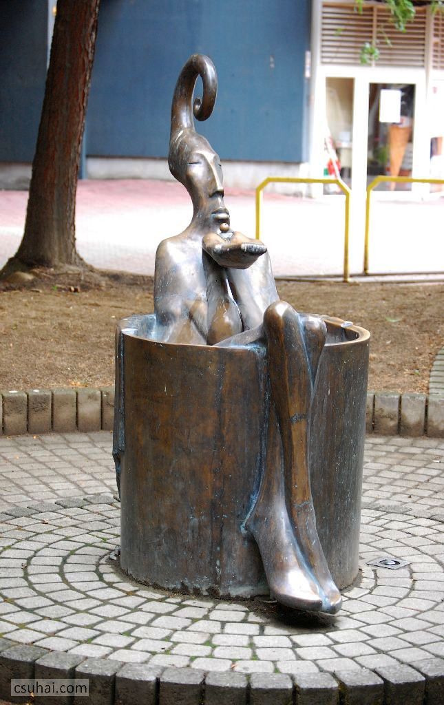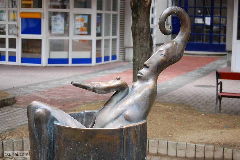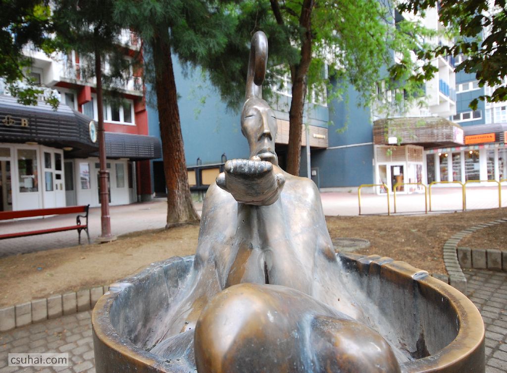 DSC_1379Fischer György Siklóson született, a pécsi képzőművészeti szakközépiskolában kezdte művészeti tanulmányait, a főiskolát 1977 és 81 között végezte el, ahol Somogyi József volt a mestere. A diploma után Zala megyében telepedett le, Zalaegerszegen nagy része volt abban, hogy az ottani Ady Endre Általános Iskola és Gimnázium tantervében a művészeti oktatás előtérbe került. Nem tartozott a felkapott budapesti elit világába, felállított szobrai kivétel nélkül választott megyéjének településein állnak. E bejegyzés főszereplője, a zalaegerszegi Európa téren (a panelházas egerszegi belváros egy kicsi parkjában) 1999-ben járókövekből kirakott köralakú kis posztamensre elhelyezett Ivókút című, életnagyságú szobra viszont rendkívüli dolog. A szobor önmagában testesíti meg, összegzi mindazokat a vonásokat, melyek egy modern köztéri díszítőszoborral kapcsolatban felmerülnek a kétezres években.