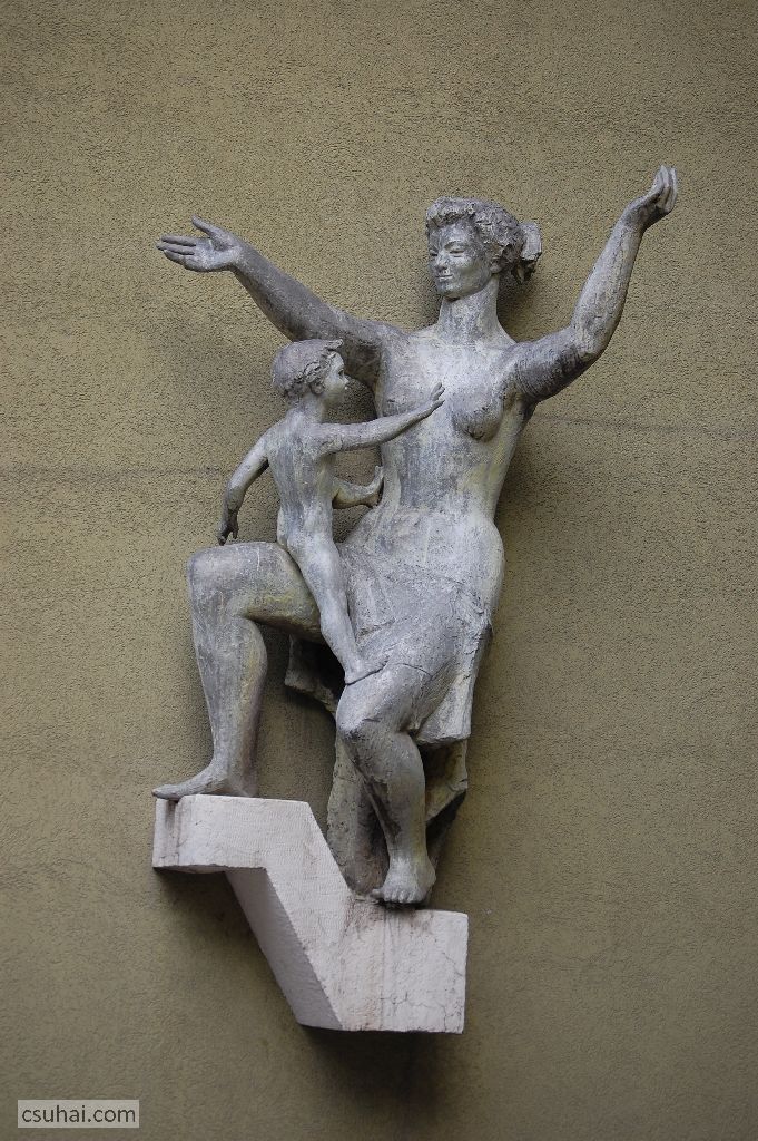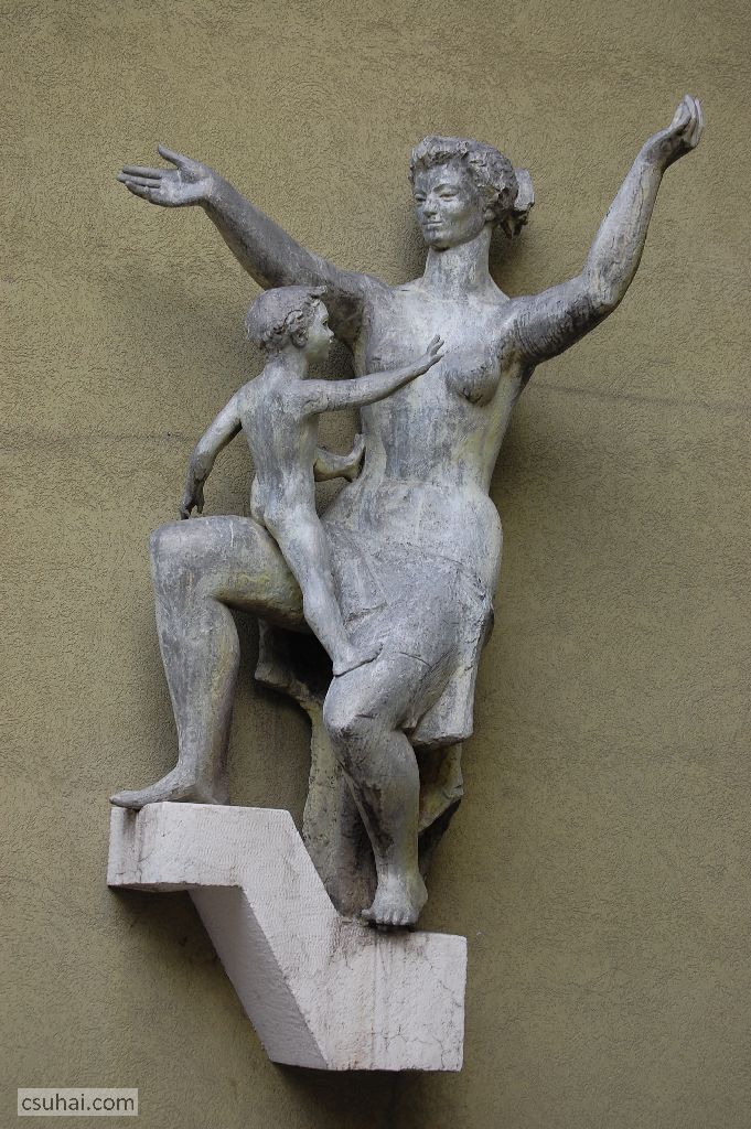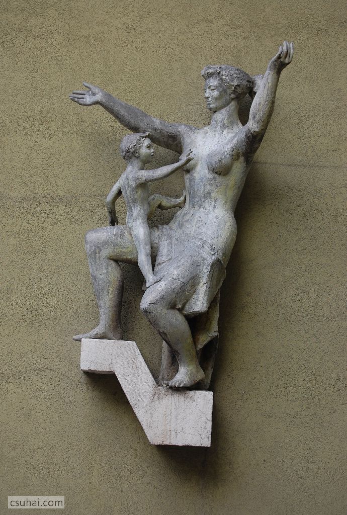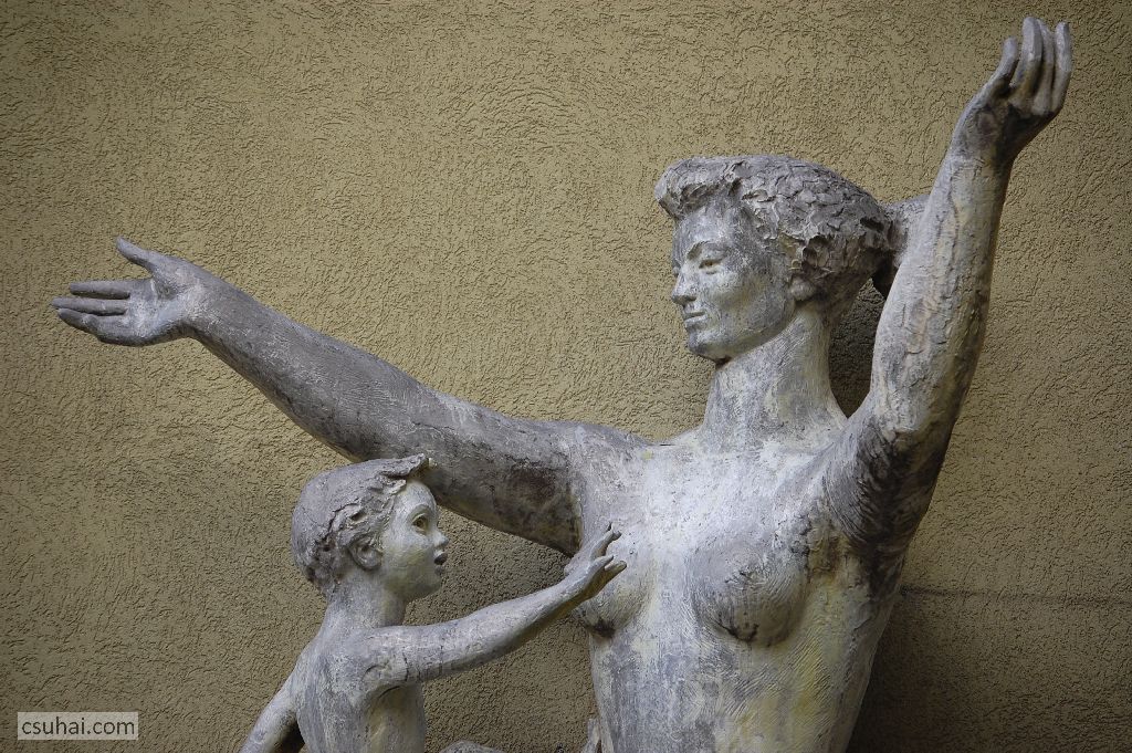 máris más a leányzó fekvése — a fiatalasszony állása és a behajlított térdén ülő kisfiú nyújtózkodása. Tudni kell, hogy a szobor eredeti állapotához képest megváltozott (a mű lapjáról a Köztérképen, a képgaléria első három archív darabja alapján ez jól megítélhető). Az anya hátraemelt bal keze