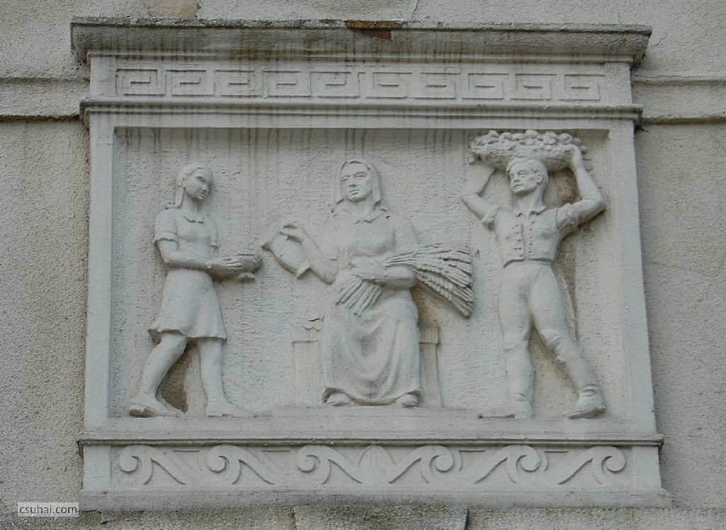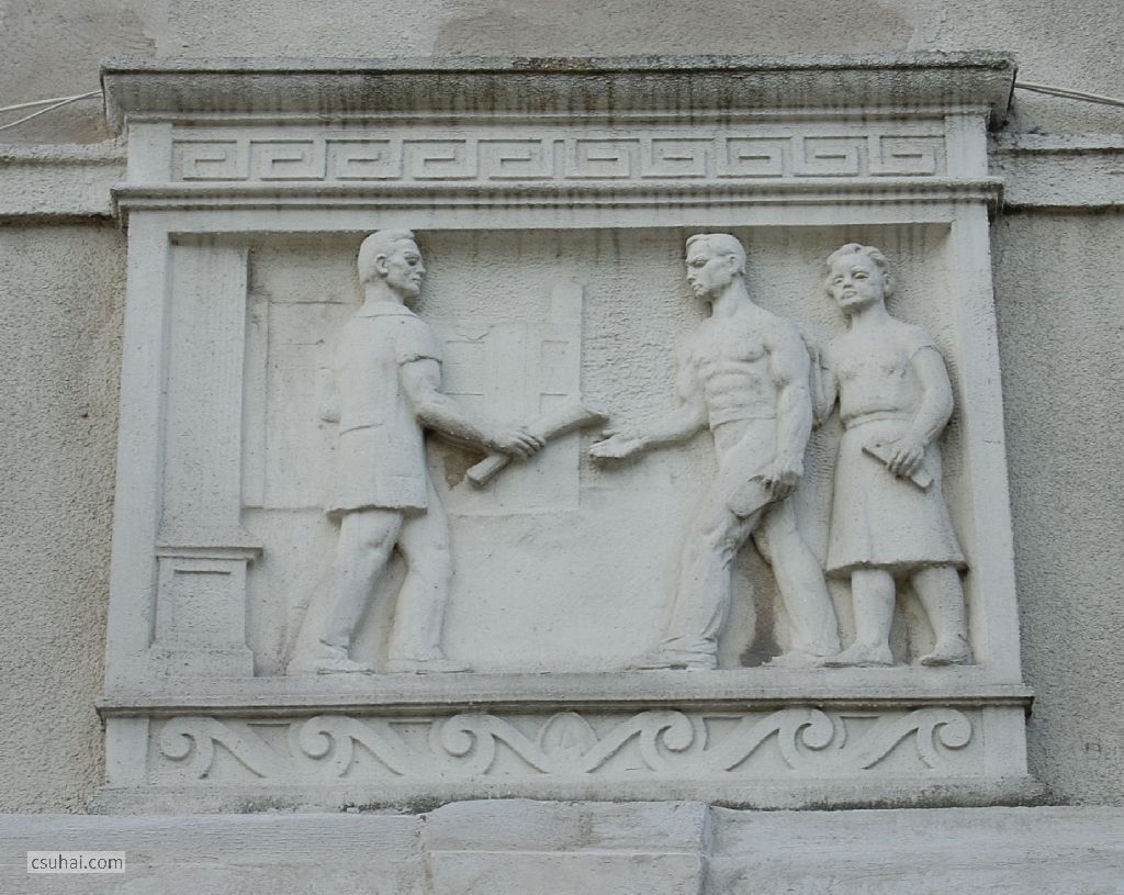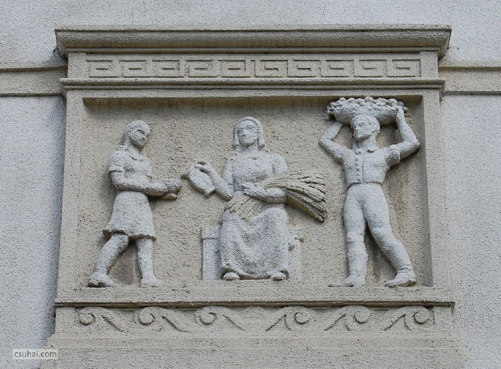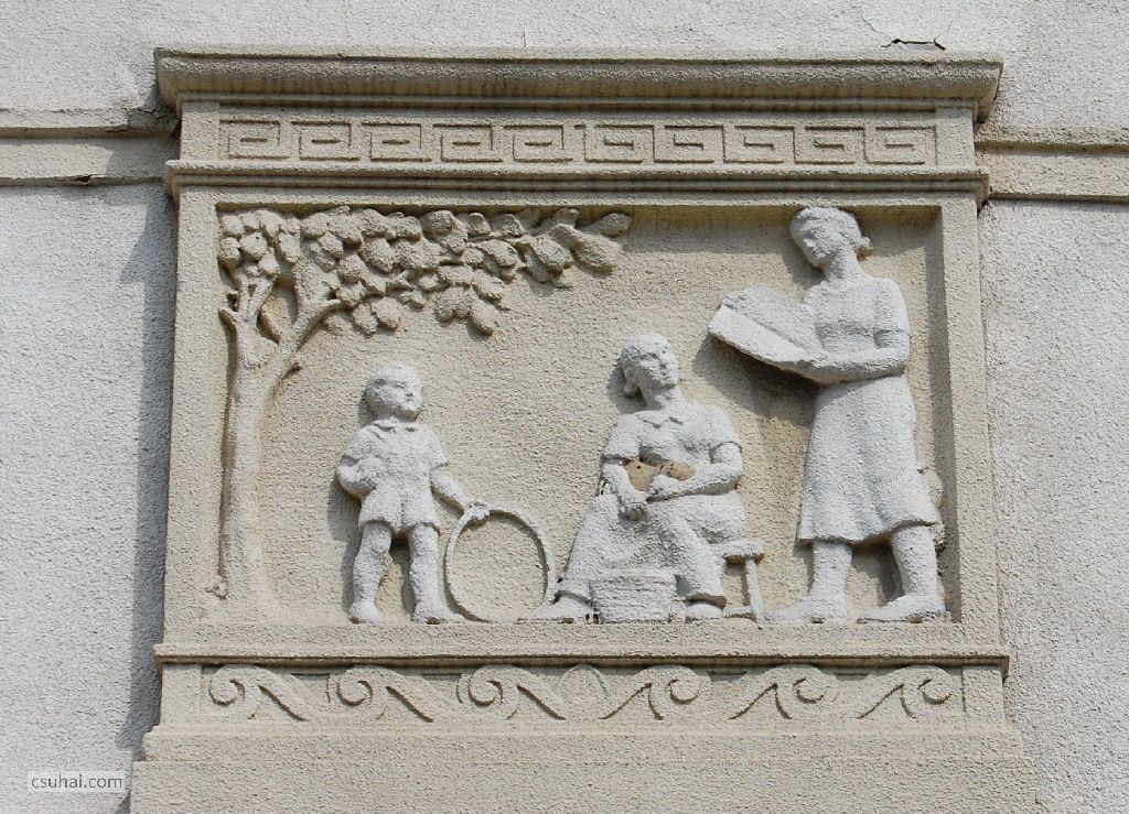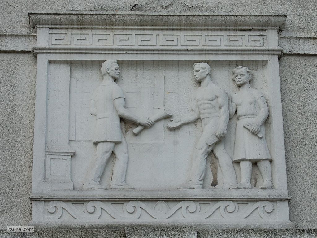 Pedig az ő épülésükre, az ő szórakozásukra, az ő jól-létükre készültek az itt következő, a szocreál építészetben megszokott kapubejárat-díszítő ornamentikák. Hogy tanulj, hogy tetsszen, és hogy jó legyen neked. Három egyforma táblakép váltogatja egymást (a végén jön hozzájuk egy negyedik), számomra ma kiismerhetetlen elgondolás szerint, a József Attila tér, illetve a külső utcák felé eső bejáratok felett.