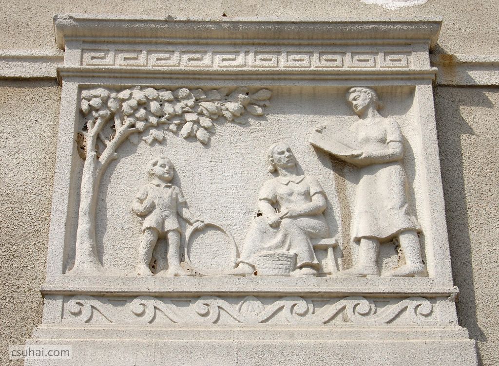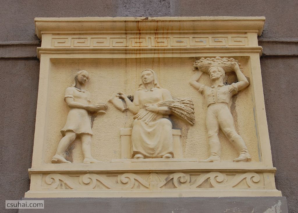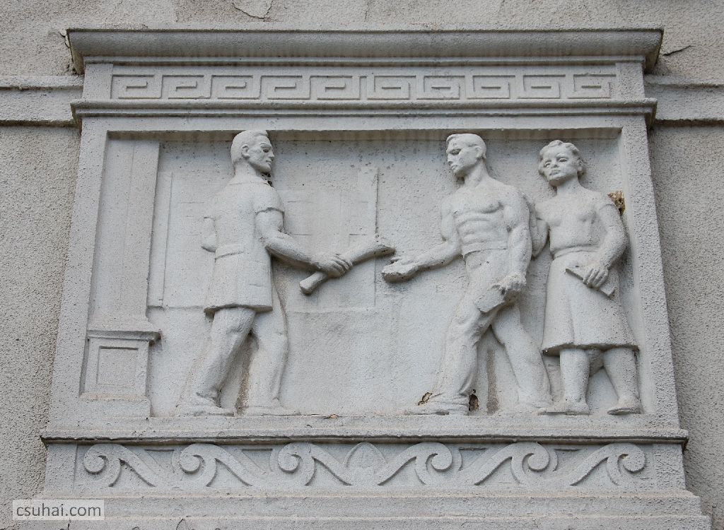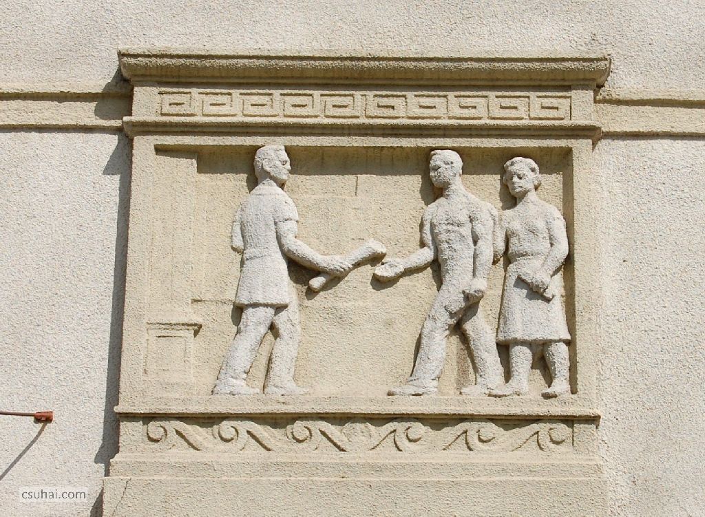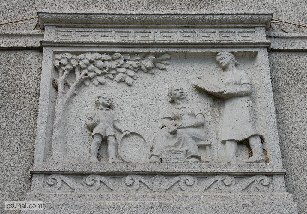 Pedig az ő épülésükre, az ő szórakozásukra, az ő jól-létükre készültek az itt következő, a szocreál építészetben megszokott kapubejárat-díszítő ornamentikák. Hogy tanulj, hogy tetsszen, és hogy jó legyen neked. Három egyforma táblakép váltogatja egymást (a végén jön hozzájuk egy negyedik), számomra ma kiismerhetetlen elgondolás szerint, a József Attila tér, illetve a külső utcák felé eső bejáratok felett.