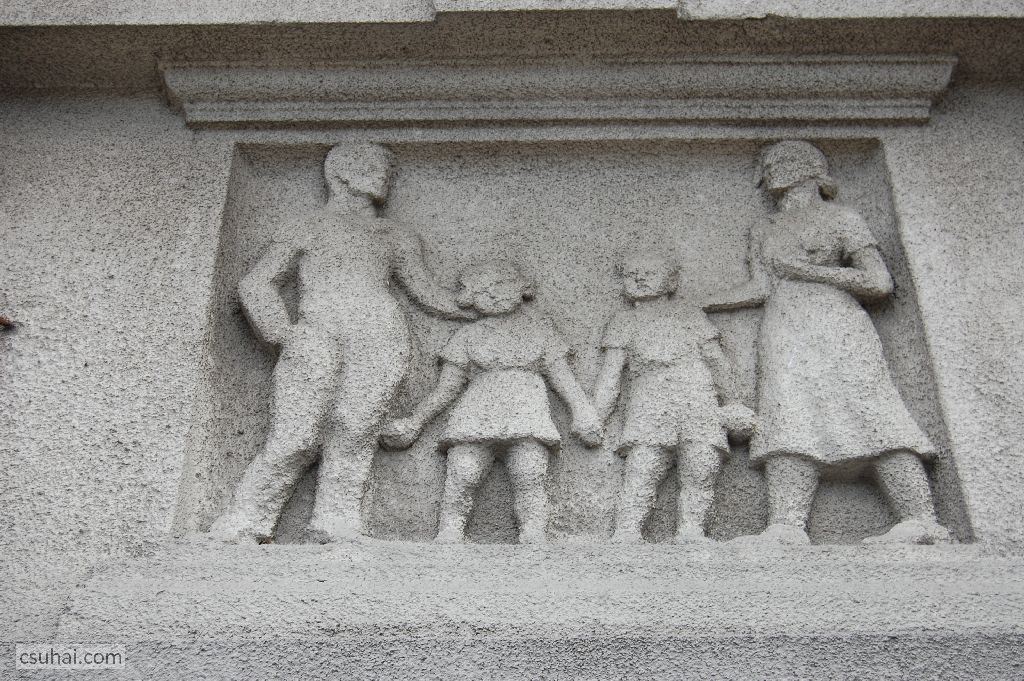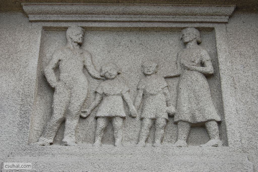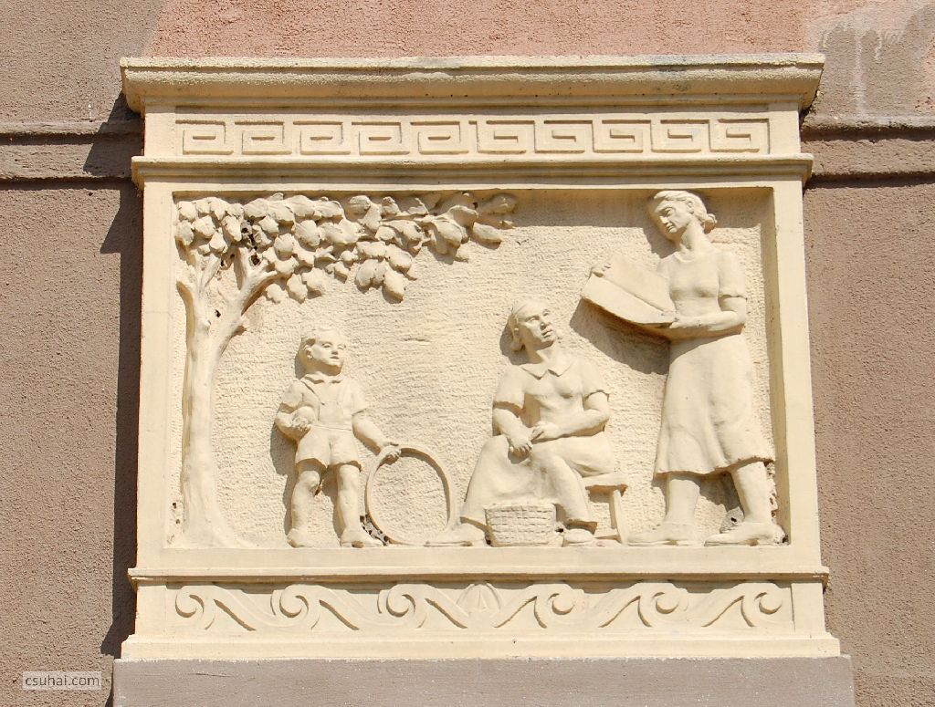 És ha úrrá leszünk a természeten, akkor is hátra van még az ember. A sorházblokk külső, a Gyöngyösi utca felé eső homlokzatán álló két díszítő domborműnek a felújítás valósággal nonszensz jelleget kölcsönzött. Az első három képpel szemben (melyekre ráfogható, hogy a vidékről városba költözés vagy a lakótelep-építés ilyen-olyan apológiái, szocreál allegóriái) ez a tábla a lakótelepen élés jelenidejét, családi pillanatképet, a legvalóságosabb idillt mutatja be két, eredetileg egyforma változatban.