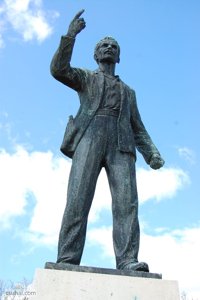 szétnyitott zakóban, jobb zsebéből kilógó kéziratköteggel ábrázolja terpeszben álló tárgyát, mint Tar István körülbelül ugyanebben az időben készített szobra Balatonszárszón.