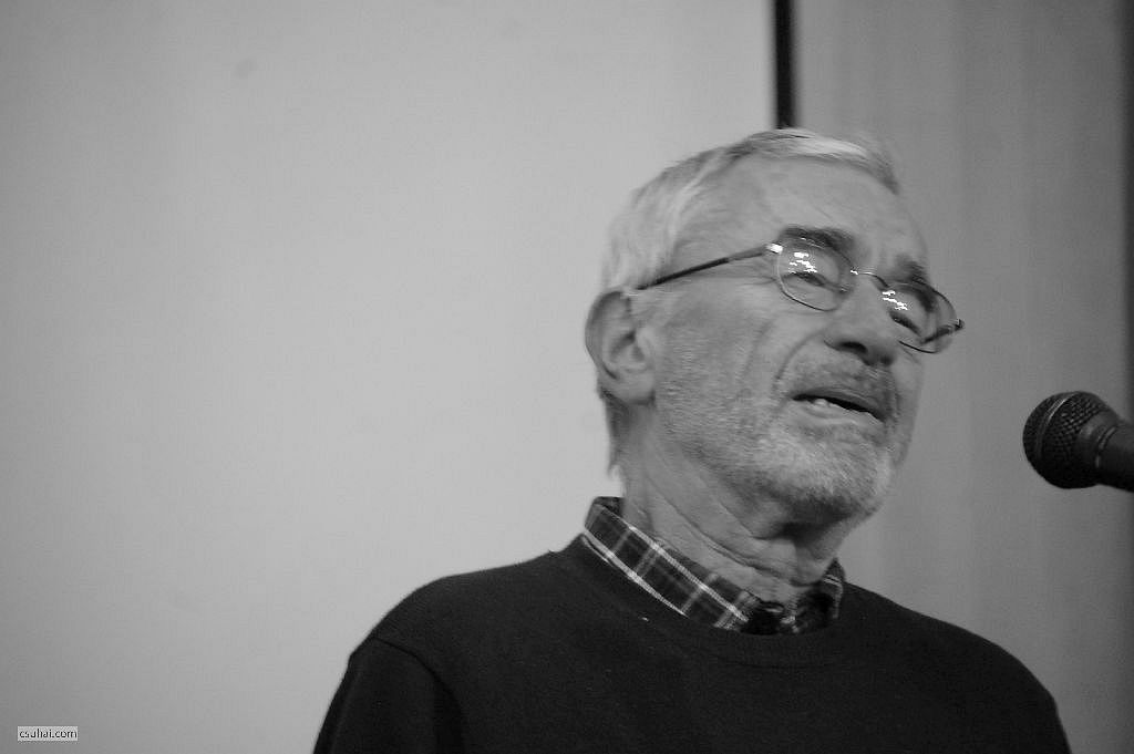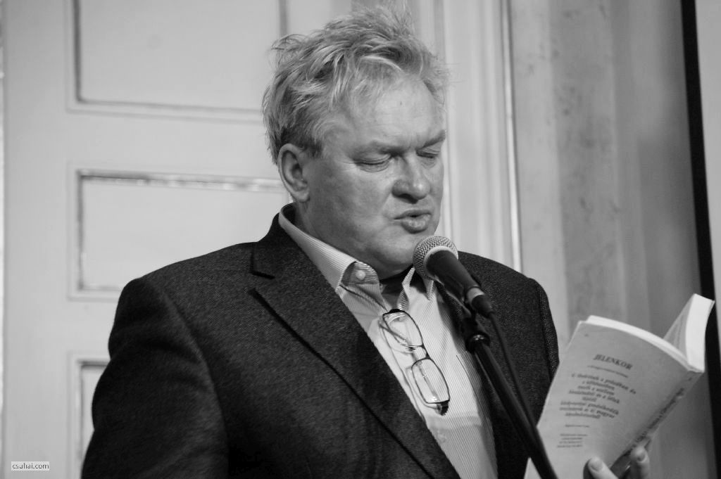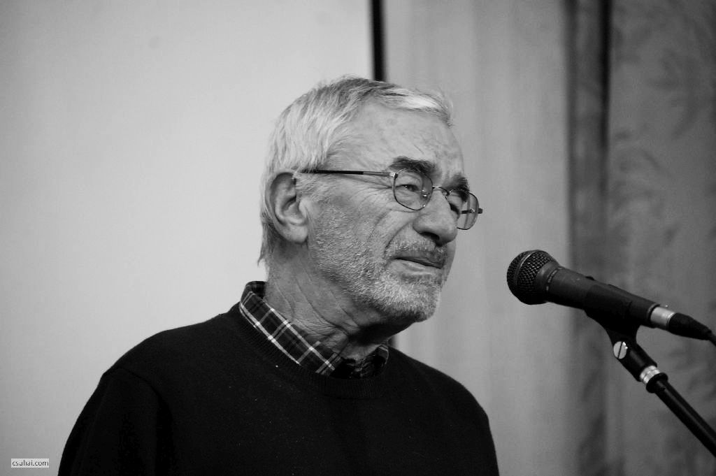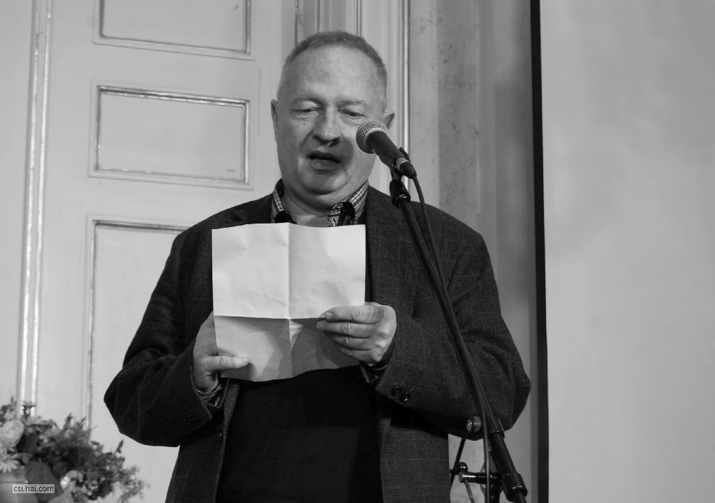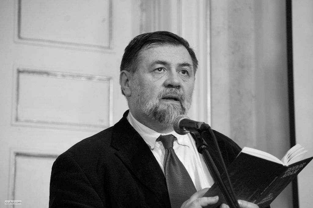 Báthori Csaba, kezében a könyvvel, Az utolsó szénégetők című tárcakötettel, mely az ő erőfeszítései nélkül talán sosem látott volna napvilágot.