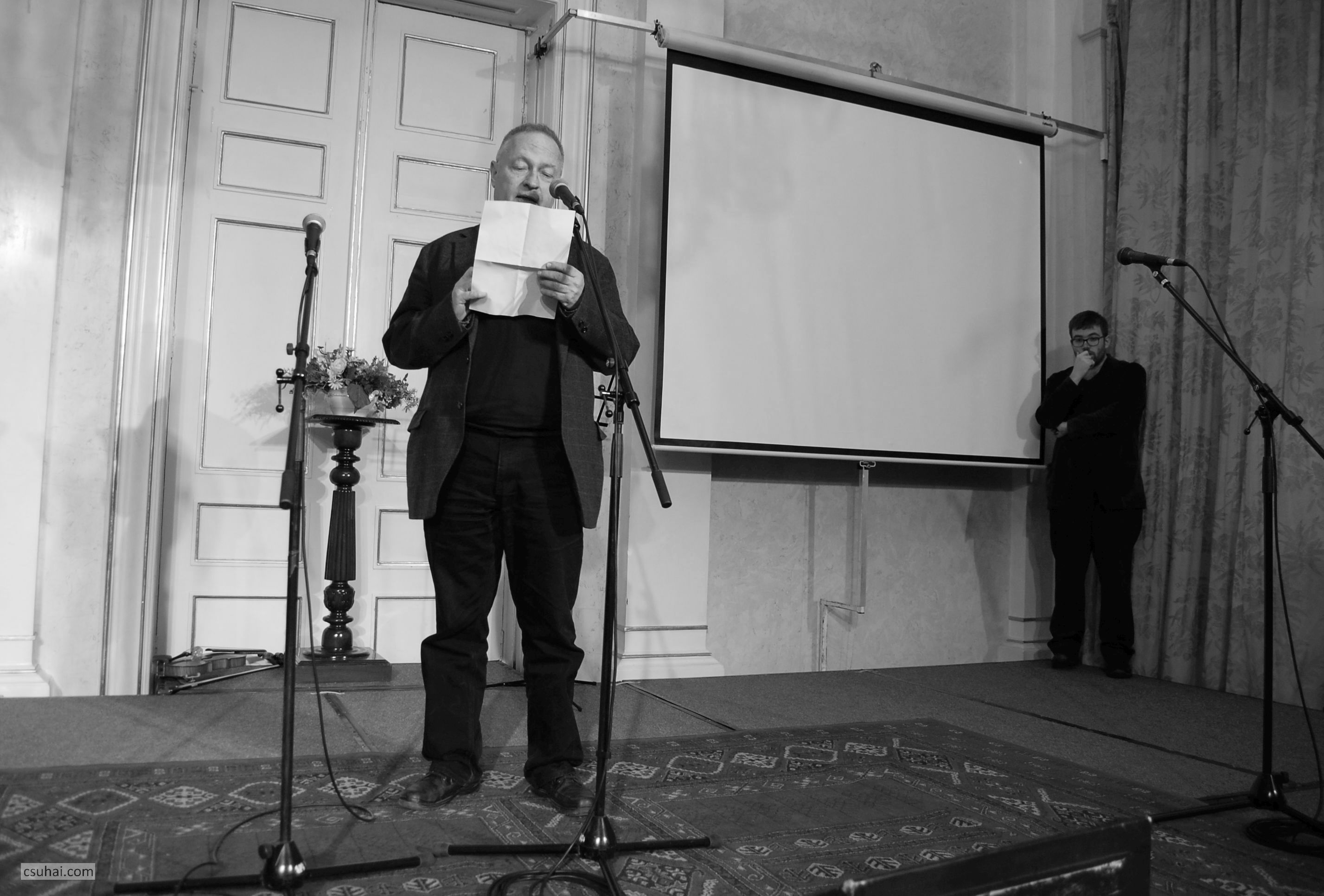 És hogy miért fekete-fehér? Őszintén szólva a Károlyi-palota színei annyira megtévesztővé tették a képeket, és a gépemmel ezt olyannyira nem tudtam ellensúlyozni, hogy muszáj volt ehhez az eljáráshoz folyamodnom — fekete és fehér, a jellegzetes Bodor Ádám-színeket meg képzelje hozzá a tisztelt olvasó.