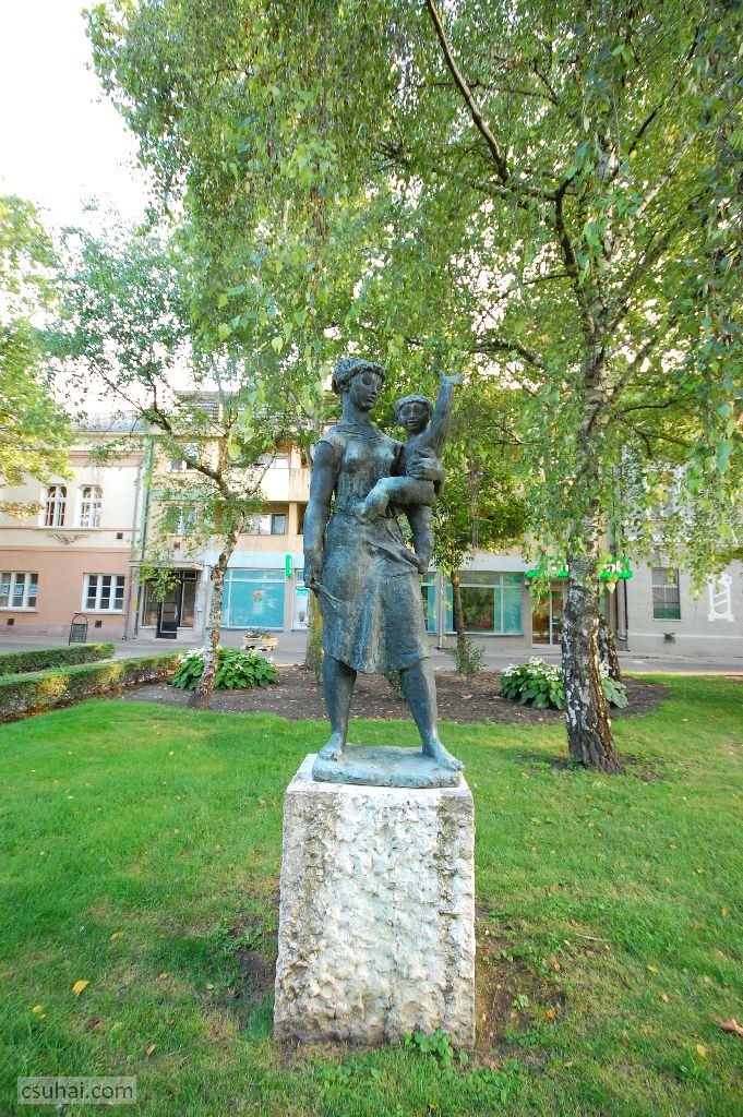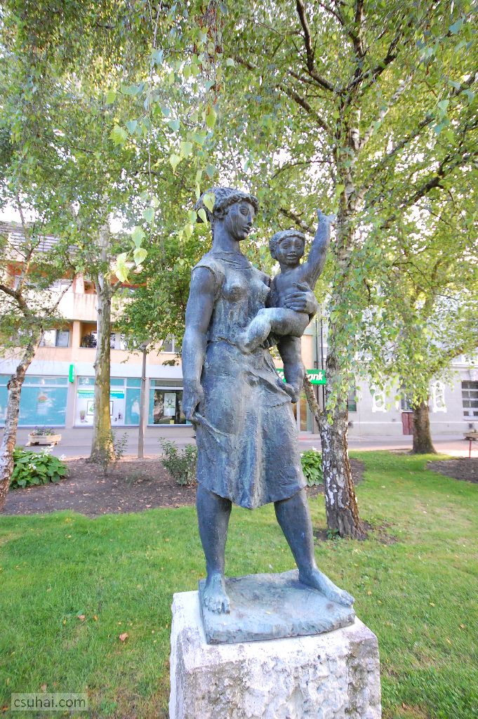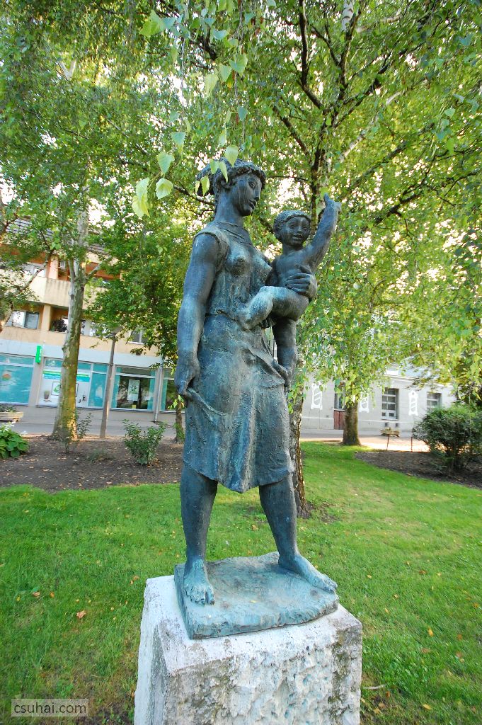Mindenki tisztában van a helyzettel, aki járt már magyar kisváros főterén. 1990 után a szobrok egy részét (többé-kevésbé joggal), alkalomadtán több, ismétlődő hullámban eltávolították, a helyükre általában az újra megtisztított első világháborús emlékmű került, új alkotásként a második világháborús és az 56-os, egy-két helyi érdekességű kopjafa, millenniumi semmiségek, országzászlók (minél újabbak, annál szörnyűbbek), a vidéki Magyarországon sok helyen a kétezres évektől kötelező Wass Albert, 2010 óta az ugyancsak obligát Trianon-emlékmű (kisebb helyeken a helyi hidegburkoló műveként hat darabra tört Nagy-Magyarország egy kősziklára vagy betonfalra applikálva) meg egy-két, még a nehéz időkben eltávozott és azoktól megnyomorított helytörténész vagy derék történelemtanár, néha domborműként, máskor mellszoborban, ritkábban egész alakos megformálásban (az egész alakos általában éppen lép valahova). Ahogy kinéztem az autóból, az itt következő szobor, ennek a bejegyzésnek a voltaképpeni tárgya valósággal kiragyogott a környezetéből. Az elhelyezése, a minősége, a műgondja, a légies nagyszerűsége révén első ránézésre kitűnt a közegből, ahol áll. Erről, a teljes kontextusról nem volt időm fényképet készíteni, e sorok olvasójának hinnie kell nekem: ez az anya gyermekkel nagyságrendekkel jobb dolog, mint bármi más, szobornak látszó tárgy a karcagi Kossuth téren.