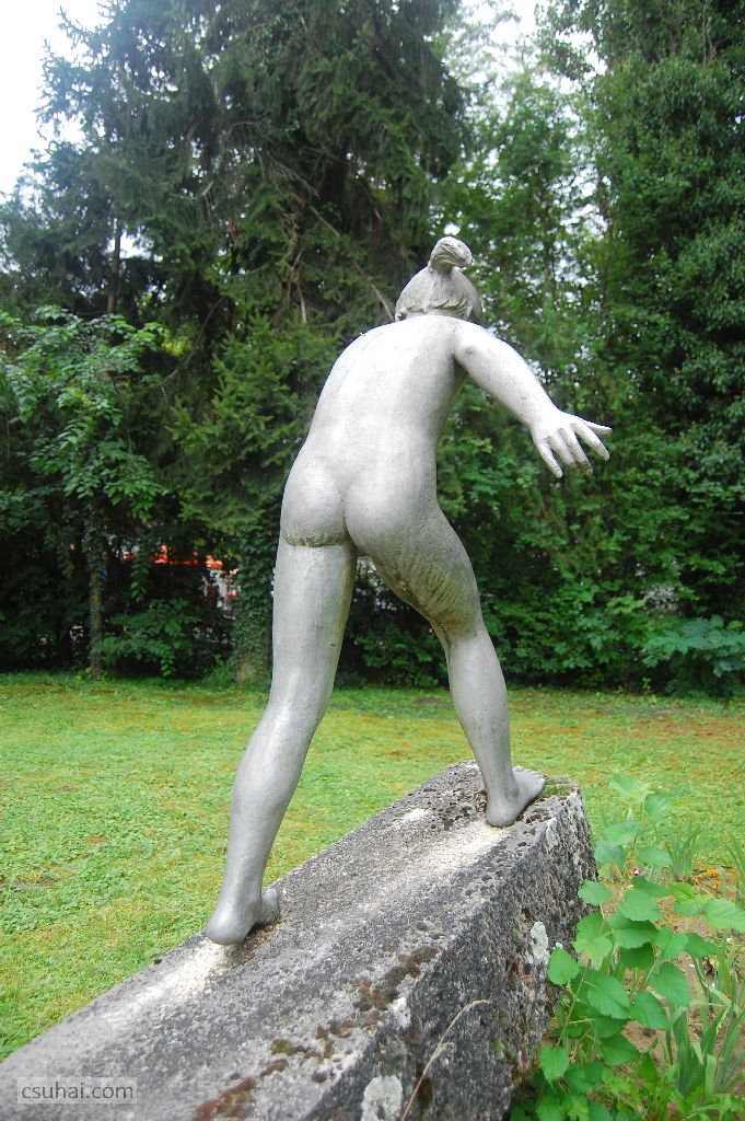 Rendhagyó a talapzata Lesenyei Márta bronzból készült Fürdőző fiújának is,