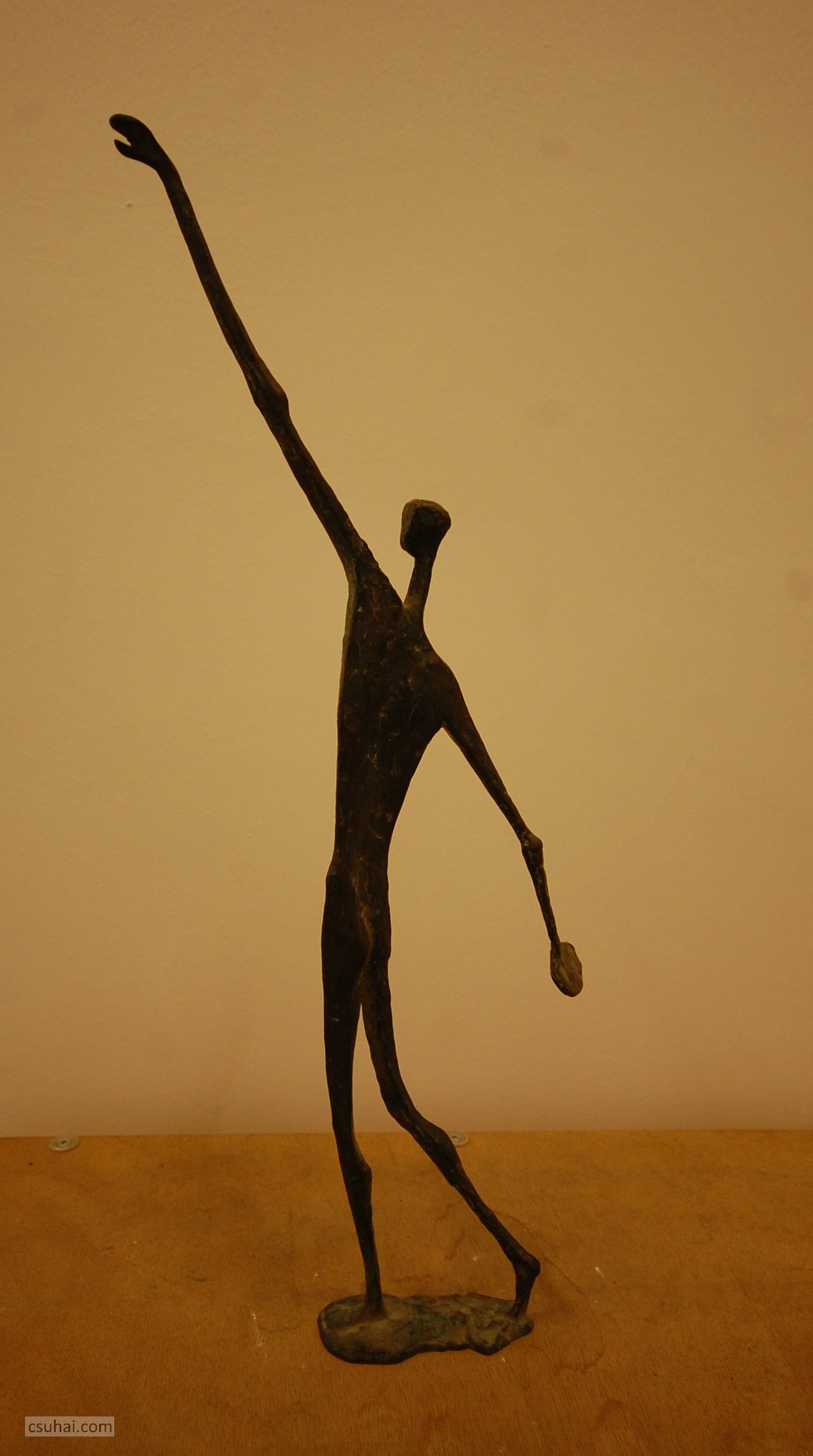 a kisplasztikai változat két évvel korábbi, mint az óvári nagy szobor, a kis talpon álló patinázott öntött bronz figura 49.5 cm magas,