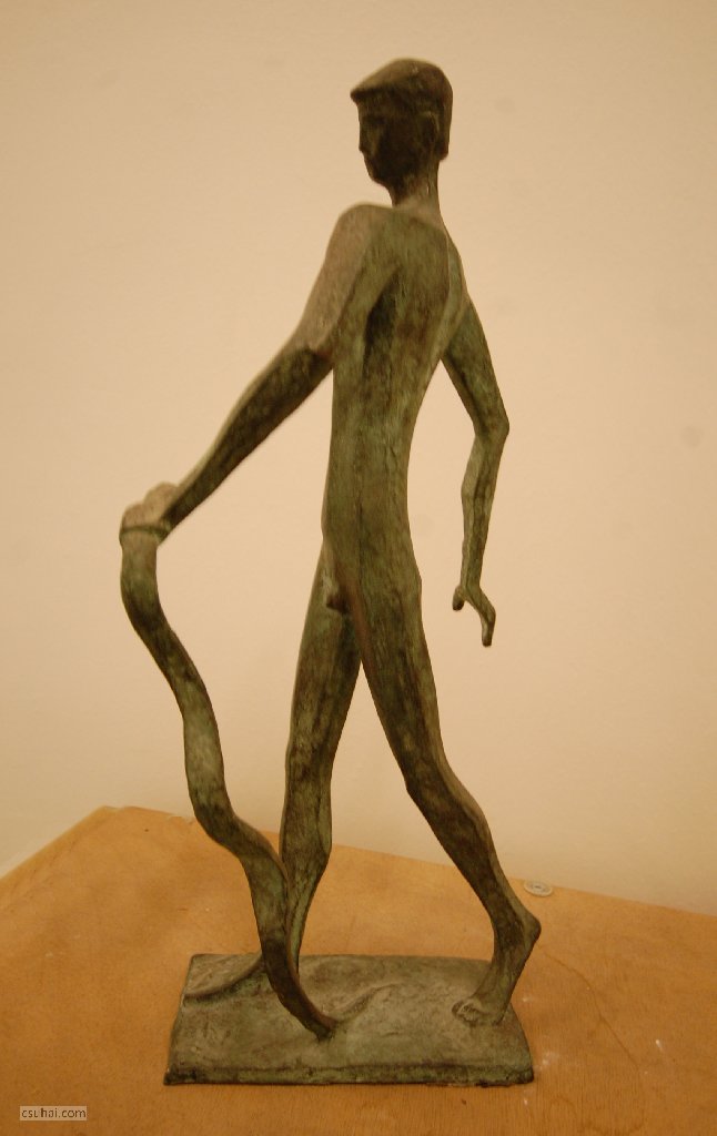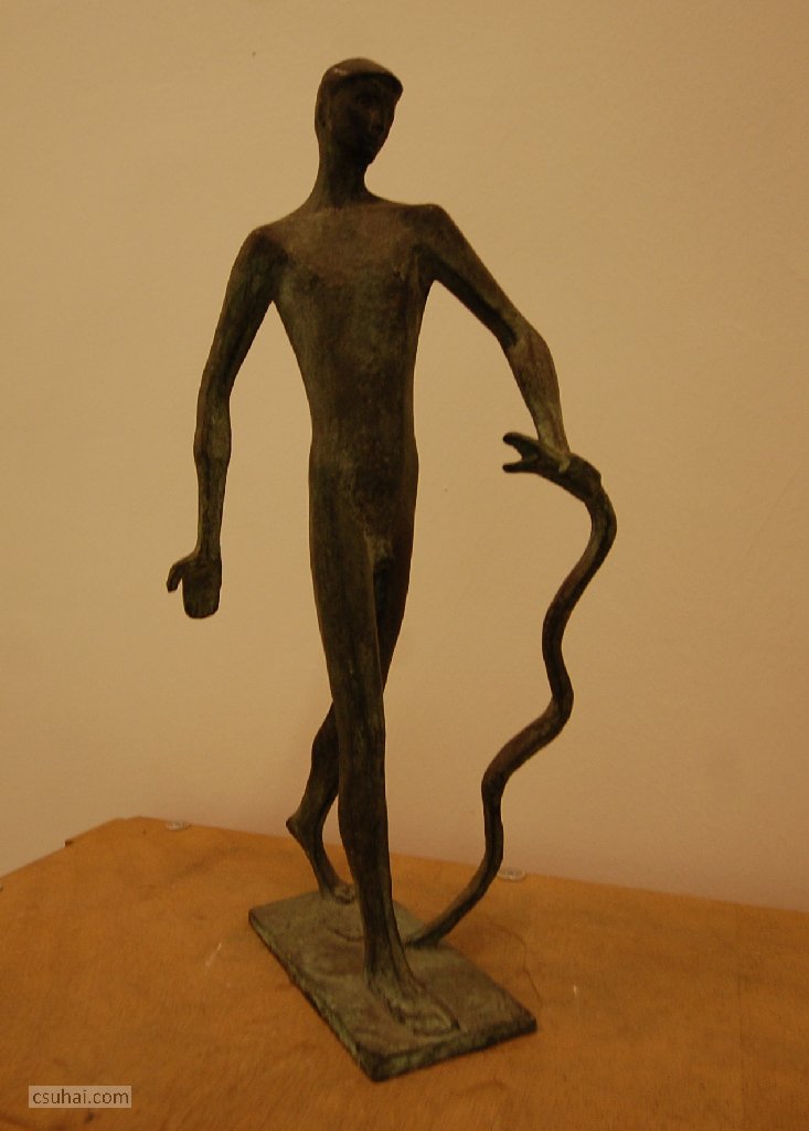 a Kígyós fiúhoz, a kisplasztika 1962-ből való, 42 cm magas, köztéri szoborként, Kígyóölőként 1963-ban állt fel a Rózsadombon, a kerületi rendőrkapitányság épülete előtt. A Laborcz Ferenc egyalakos szobrait bemutató sorozat első darabjaként hosszabban írtam róla annak idején, 2014 tavaszán,