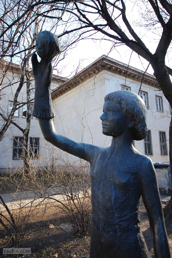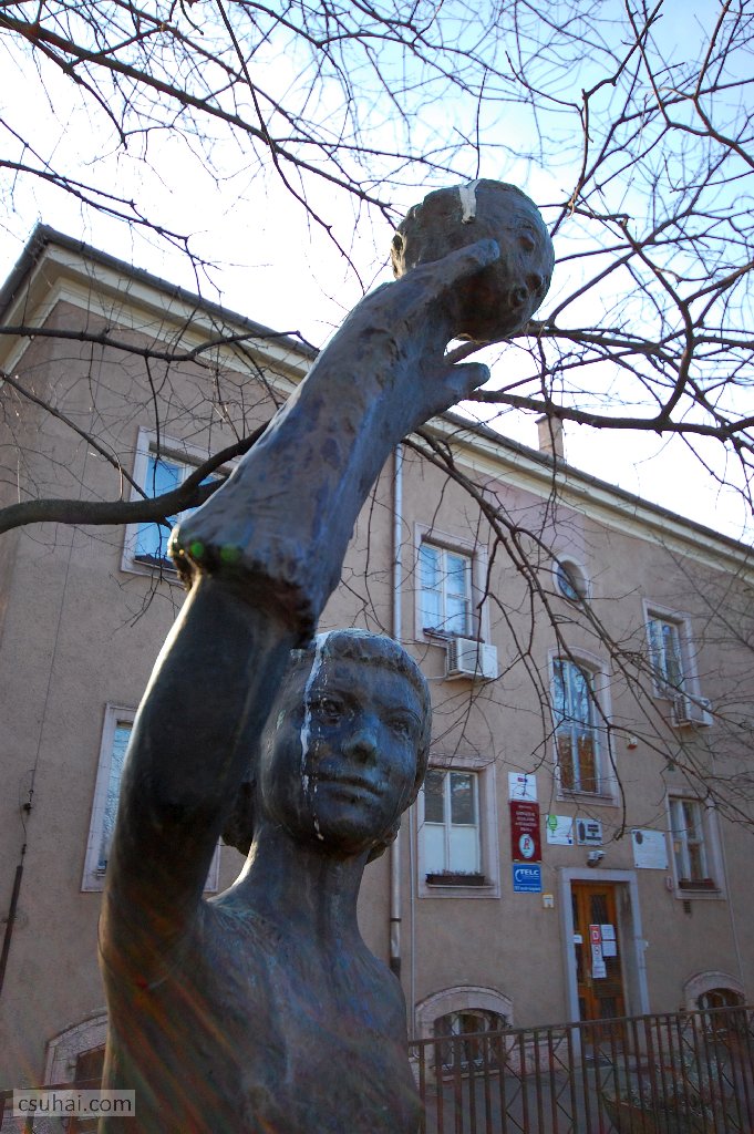 ezt a témájánál fogva feltétlenül egyedülálló szobrot — kultúrház és iskola között, egyik és másik uraságnak is adózva –,