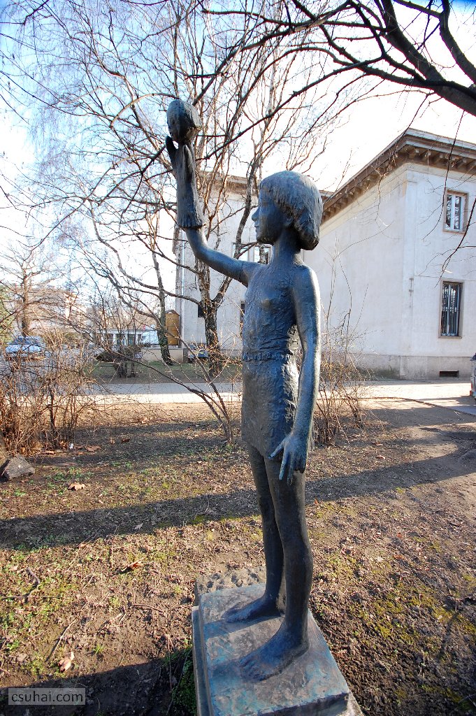sallangmentesen megrajzolt Bábozó kislány. Röviddel a bejegyzés közreadása után hívta fel a blog egyik olvasója, a csodálatos Záhonyi Enikő a szobor legmegkapóbb momentumára, a bal kéz ujjaira a figyelmemet. Épp elég sokat nézegettem ezeket a képeket, hogy magam is észrevehettem volna, amit ő: a kislány a bal kezével, az ujjak tartásával, a kinyújtott hüvelyk-, mutató- és nagyujjakkal, illetve a behajlított gyűrűs- és kisujjal önkéntelenül utánozza bábos, nem látható jobb kezét, és ez a nagyon apró gesztus az így létrehozott ismerősségével, az elmerülés és a koncentráció leheletfinom érzékeltetésével azonnal átírja, közelebb hozza kicsit nézőjéhez az egész szoborkompozíciót.