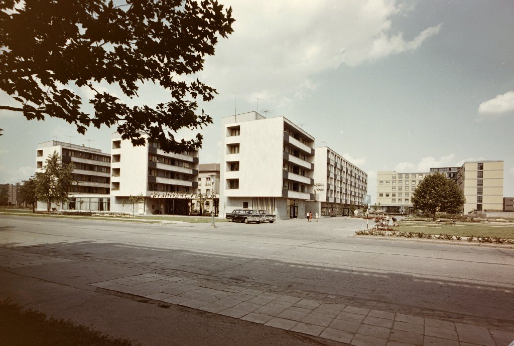A szobor ugyanis ebbe a térbe került, a balra lévő Bartók Béla Kultúrház és a jobbra álló Rosti Pál Gimnázium (a kép készítése idején még a Sztálinvárosi Tanács Általános Iskolája, körbekerítetlenül) közötti gyalogút Bartók térre eső végébe, kicsit közelebb vonva az iskola kerítéséhez. 1973-ban ez a hétköznapi, eredendően nem diadalmas hangvételű szobor elhelyezése itt, ezen az “ünnepi” helyen szentségtörés volt, a régi sztálinvárosi étosz mecsiklandozása. (Ennél csak akkor lett volna nagyobb, ha a pártház elé helyezik.) Ma különben a színháznak is helyet adó szocreál épület előtt, körülbelül a jobbra látható fenyő vonalában, középen