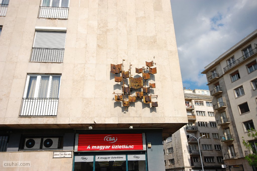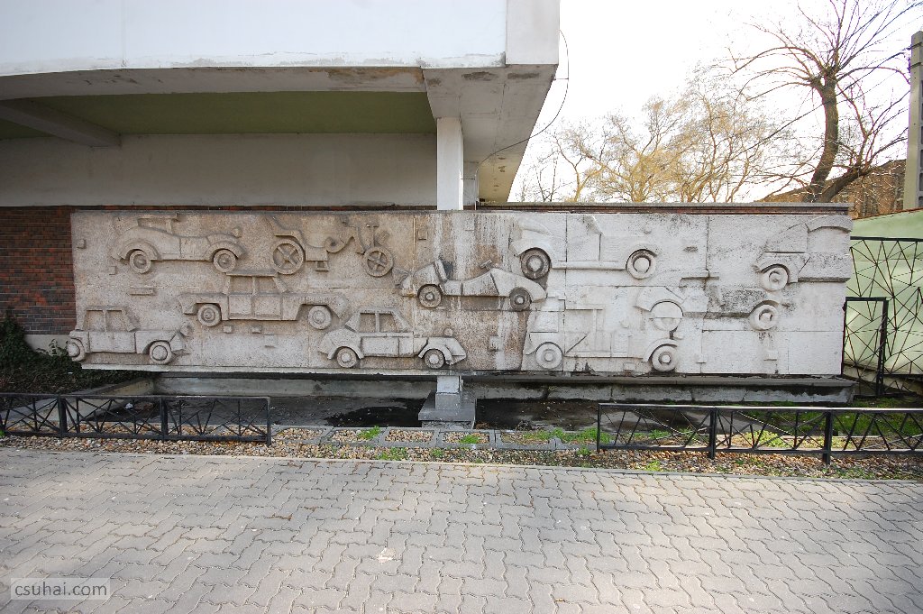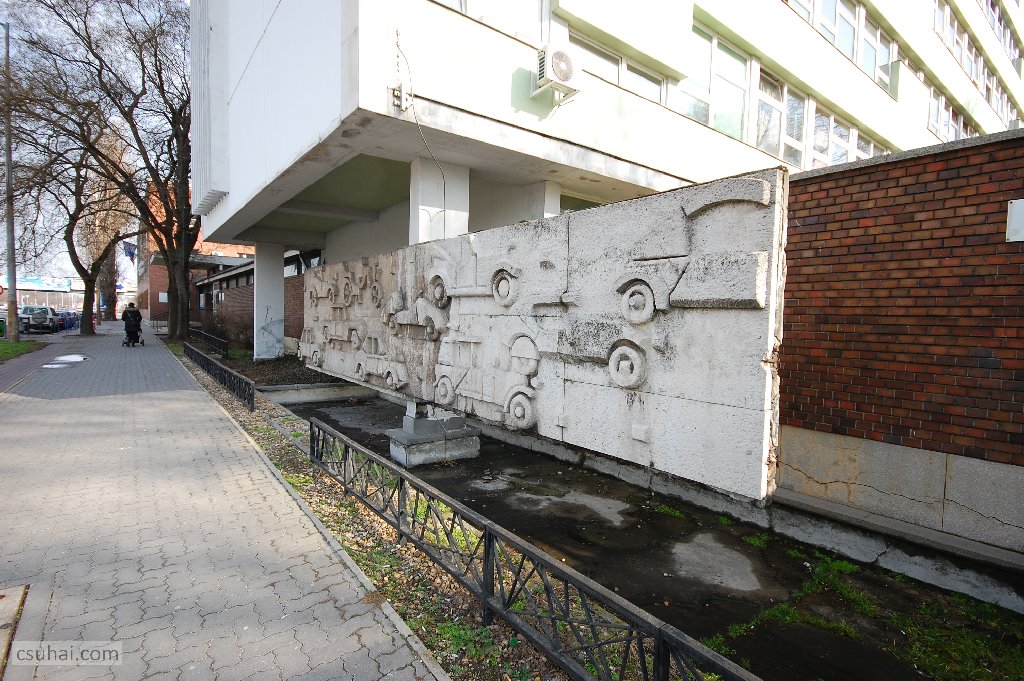 dsc_46962014-02-20_11-19-19ahogy témaválasztásánál fogva ma újszerűnek, a korból kikacsintónak tetszik az Autók története című, 8 méter hosszú, 2 méter magas betonlapra és az épület egyik tartópillérére applikált mészkő dombormű is, az egykori Váci úti Iparitanuló Iskola (a fénykép készítése idején Bánki Donát Közlekedésgépészeti Szakközépiskola és Szakiskola) utcaszinti homlokzatára sajátos megoldással került díszítő munka, a hasonló funkciójú Vilt-reliefekből az egyik utolsó.