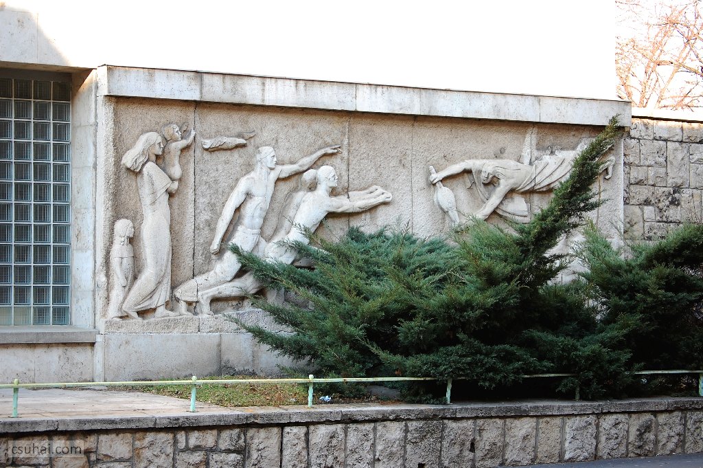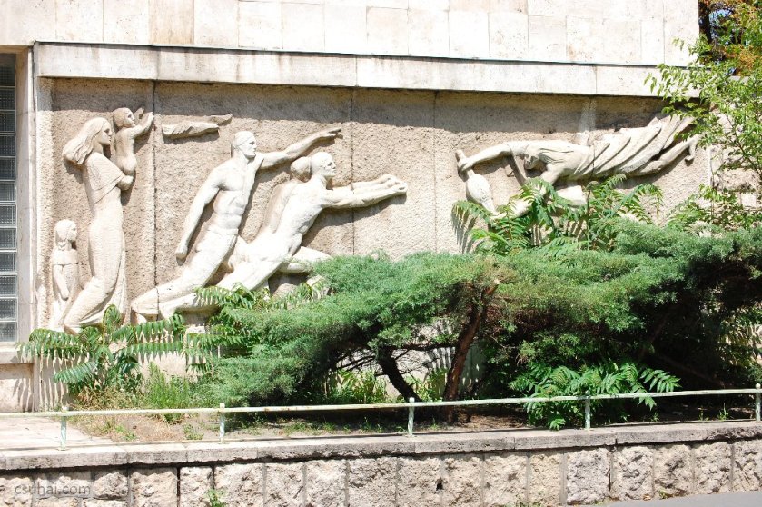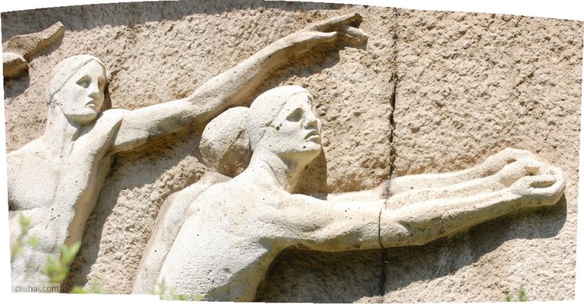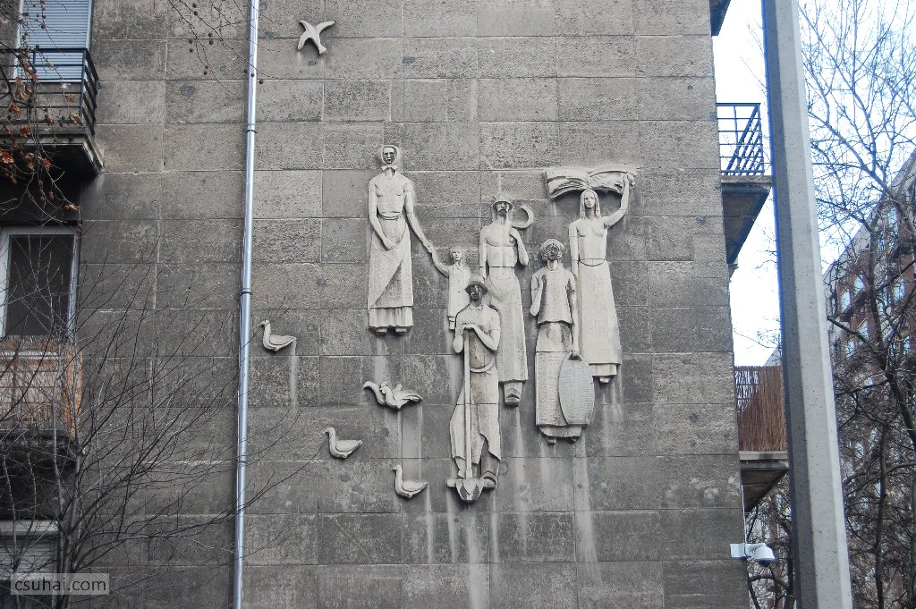 dsc_87102011-08-24_12-09-10És még ezeknél nagyobb méretű relief is lesz aztán, Egerben az egykori IV-es számú (Belvárosi) Gyakorló Iskola homlokzatán, a kiugró, a lépcsőházat elfedő portikuszon 1960-ban elhelyezett Béke című dombormű,