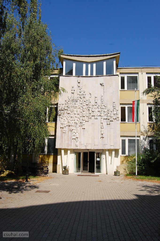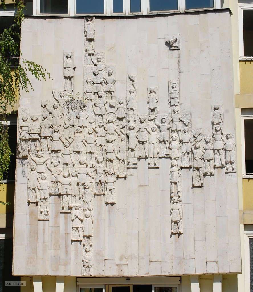 dsc_86962011-08-24_12-06-21éneklő gyereksereg nagy számban, rendhagyó elrendezésben, egyikük kezében ott a tábla a címmel (ez ebben a nagyításban is jól látható, a vízszintes balra kilógó sorban balról a második), másikuk lábánál (a vízszintes sorban legjobbra) a szobrász neve és a készítés évszáma. (Ez az elrendezés különben mintája lesz a Laborcz Ferenc az egykori Biogal-gyógyszergyár főépületén látható Vegyészeiről szóló posztban emlegetett fali domborműveknek, Makrisz Agamemnon 1964-es zuglói és Vasas Károly 1968-as kiskunhalasi reliefjeinek, voltaképpen az 1965-ös Vegyészeknek is.) Lényegében semmilyen jelentős különbség nincs Vilt 1960-as és 1942-es épületdíszítő műve között, ugyanaz a stílus, ugyanaz a tágabban értett téma, függetlenül a fennálló politikai rendszertől, bár egészen azért mégsem felcserélhetők egymással.