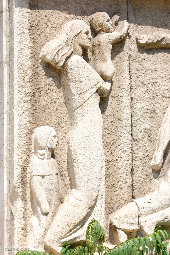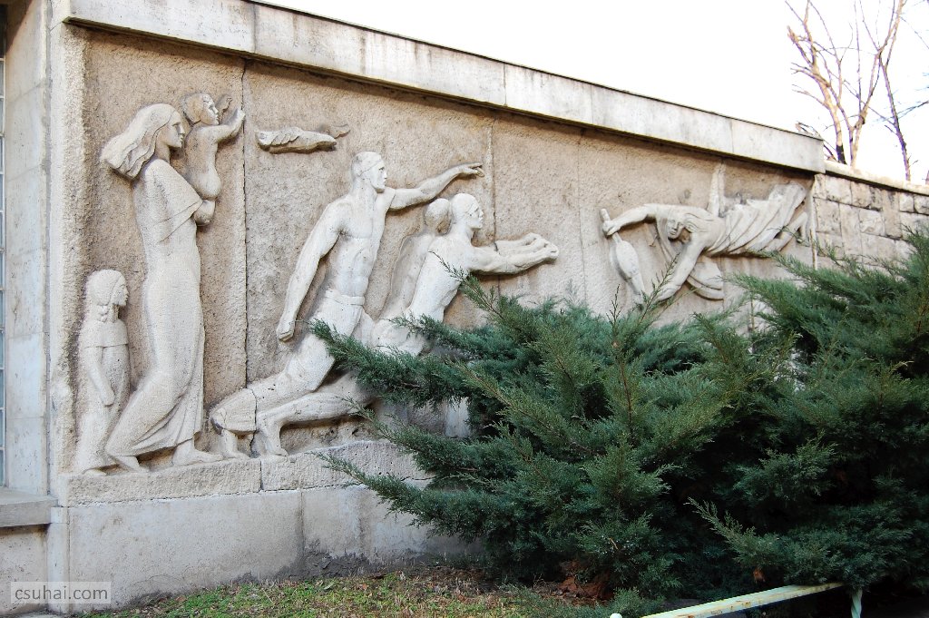 dsc_87512009-07-17_19-12-25a Sajó István és Králik László tervezte debreceni OTI-palota (ma Kenézy Gyula Kórház és Rendelőintézet) bejáratának két oldalán álló két nagyobb méretű domborművet. (Sajó István a huszadik század egyik rendkívüli építésze volt, sikeres, termékeny németországi és amerikai évek, több általa tervezett épület megépítése után települt vissza Debrecenbe még jóval a háború előtt, hogy sok más mellett legjobb gyerekkori barátom nagypapája lehessen; de többek között a régi nagyerdei sportstadion, sok ma is álló villaépület ugyanott és részben a régi debreceni vasútállomás tervezése is az ő nevéhez fűződik.) Ezek — és a saját kép híján itt be nem mutatott többi hasonló mű — mind jelentős, a domborműportrénál vagy egy emléktáblánál jóval nagyszabásúbb ornamentikák.