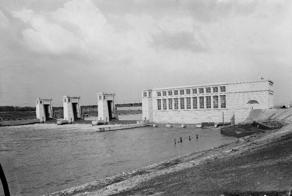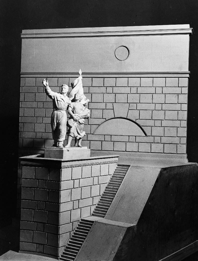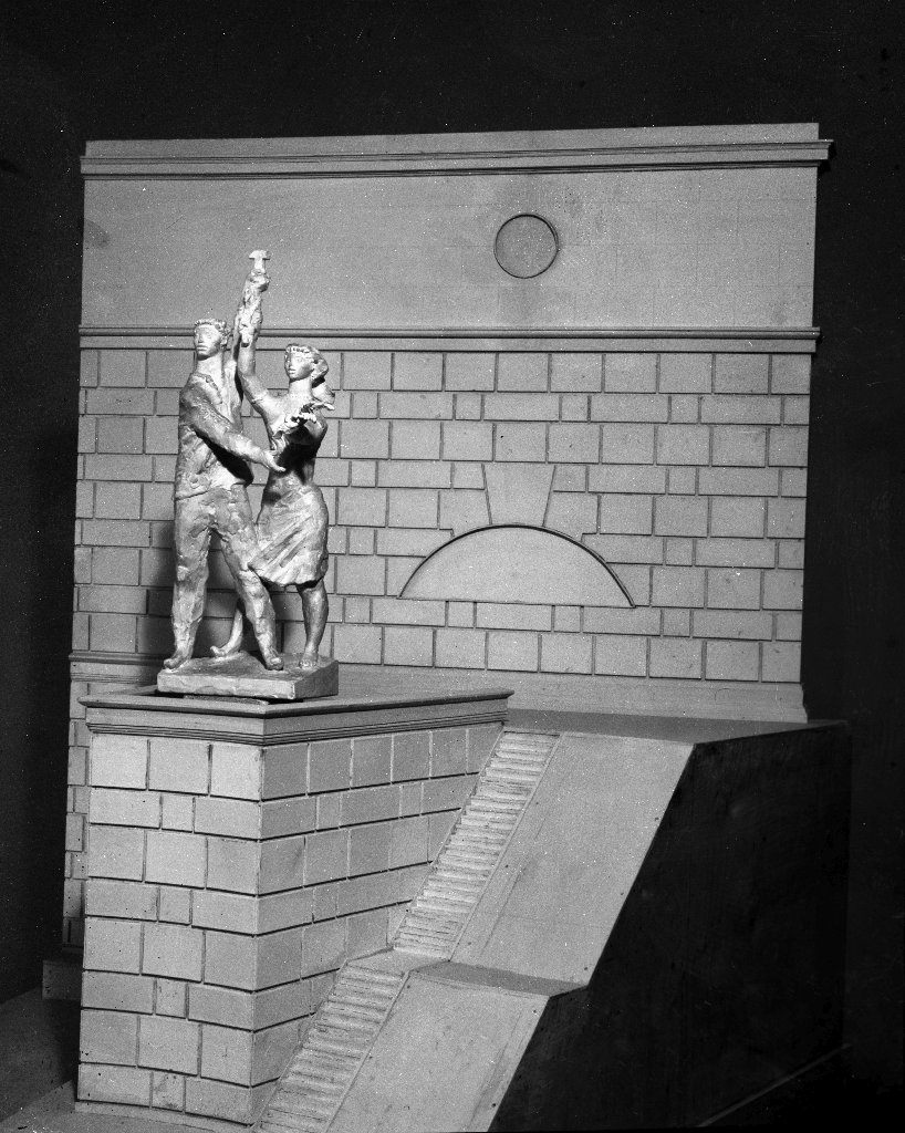 Fortepan-azonosító: 91633. A Fortepanra feltöltött  mindkét kép negatívja vízszintesen megfordult; ezek, az itt láthatók a makett helyes állásai. A vízerőműnek nem volt bal oldali, a Tisza közepére eső pilonja (a távolság miatt a szobrot nem is nagyon lehetett volna kivenni), továbbá valószínűtlen, hogy a korban egy hős férfi bal kézzel mutatta volna a helyes utat.