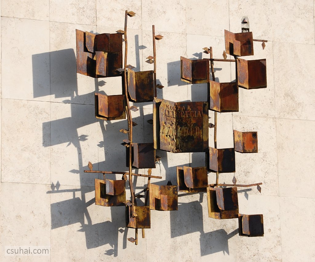 dsc_02092014-04-27_15-54-34A rákövetkező évből való, 1961-ben készített Apáczai Csere János-emlékjel nemcsak anyagában, hanem egész alapötletében és nem emberábrázoló jellegében is elüt a korábbi díszítő reliefektől, úgyszólván a modern absztrakt alapjaihoz visszaforduló, kitűnő falszobor,