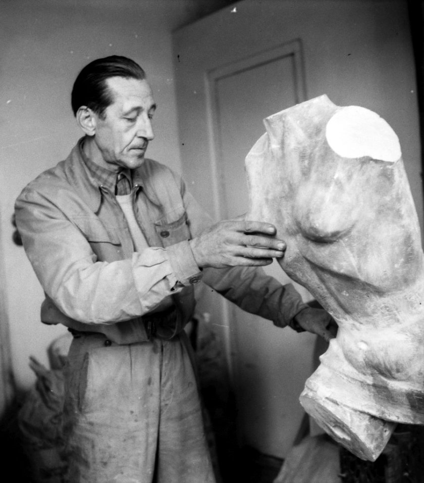 ezt az 1956-ban készült szépen cigiző változatot választottam, mert ebben van benne leginkább az a kaján derű, ami Viltet érzésem szerint mindent összevetve mégiscsak jellemezte. És hát, ahogy mondani szokás, most ugrik — a nem a vilámmal a kezében szaladó meztelen nő, hanem — a majom a vízbe. 1960-at írunk, és Vilt Tibornak néhány kisebb félalakos- vagy mellszobrától, a fentebb bemutatott épületdomborművektől eltekintve egyetlen egészalakos, háromdimenziós munkája áll köztéren: Tiszalökön, egy katonailag zárt, turista vagy érdeklődő számára gyakorlatilag megközelíthetetlen ipari létesítményben, miközben ötvenöt éves, harmincvalahány éve stabilan a pályán van, és méltán hatalmas benne a szobrász-öntudat. Bár az összetétel 1977-ből, Rózsa Gyula tollából származik, minden bizonnyal pontosan jellemzi már ezeket az éveket is: “hivatásos szobrászként” tartja számon önmagát, egyáltalán nem ok nélkül. Nincs nap az életében, amit ne érdeklődése legfőbb tárgyával,
