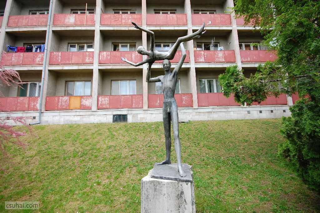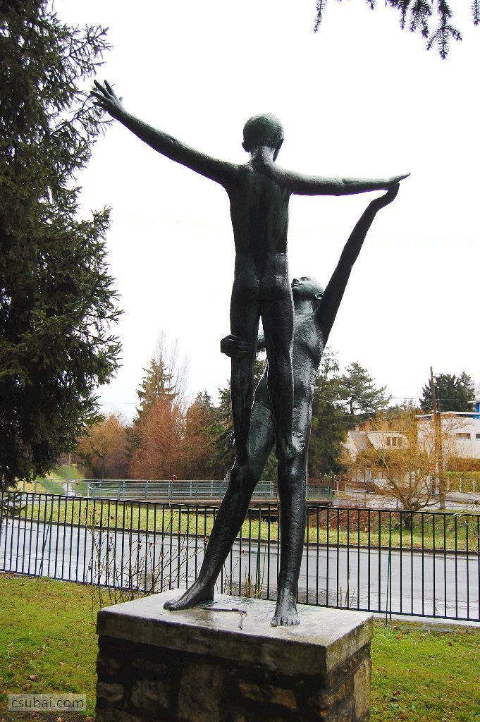 és egy rendhagyó Batthyány Lajos ábrázolás, egy igazi klasszikus palástbüszt a Veszprémhez tartozó Gyulafirátóton, a településen átvezető országút kanyarulatában (amúgy ez az 1999-es portré Nyírő Gyula utolsó köztéren felállított műve). Elfogadom, ha az olvasó ezen a ponton azt mondja, hogy mindebben semmi eget rázó nincs. Egészen más viszont a helyzet, ha rátérünk a poszt voltaképpeni tárgyára, a Komlón, a szénbányák akkori Legényszállója előtti kis füves rézsűn 1966-ban felállított kétalakos alumínium kompozícióra,