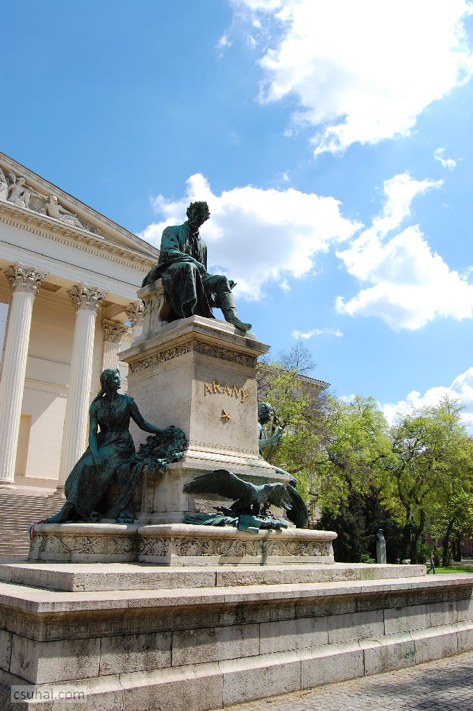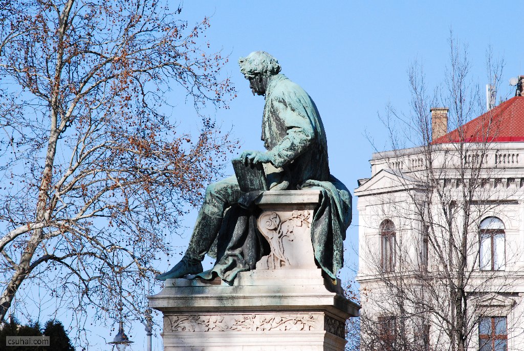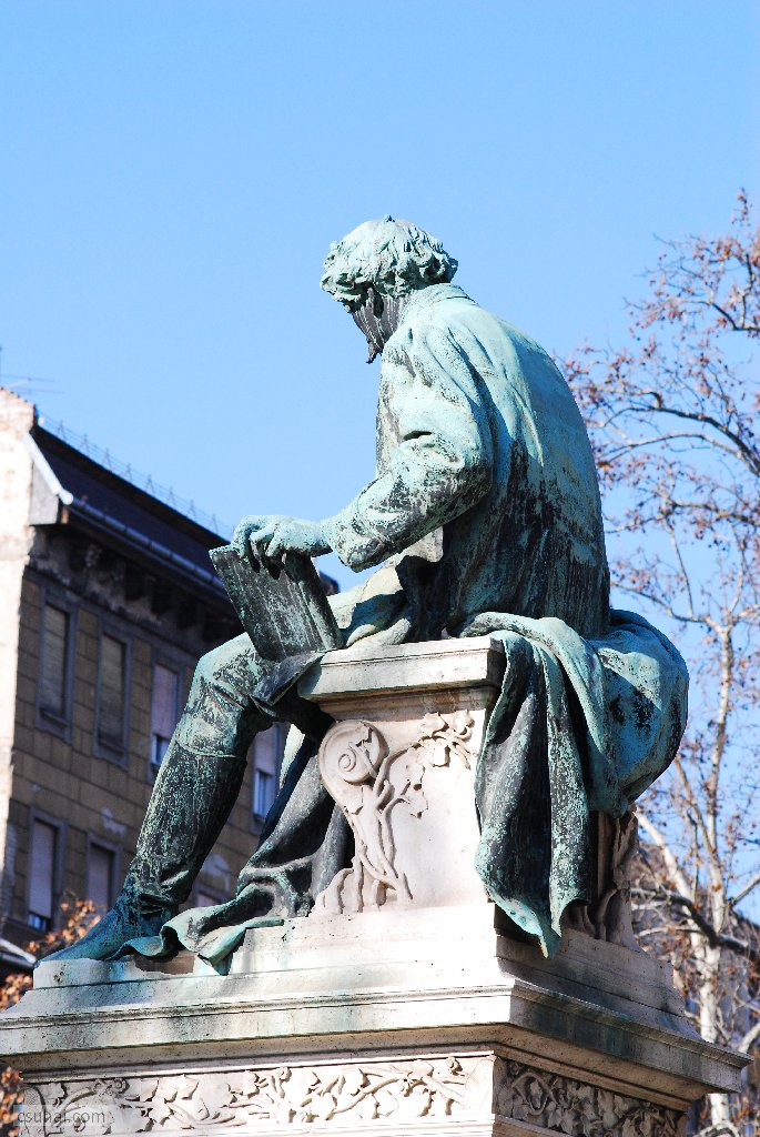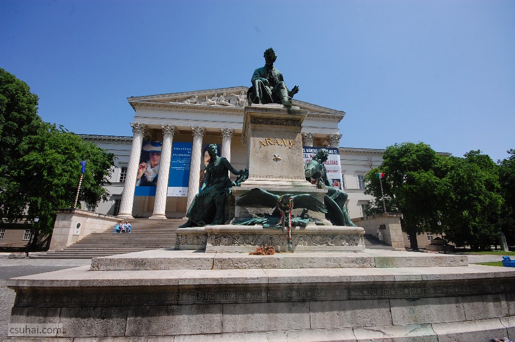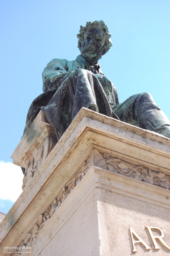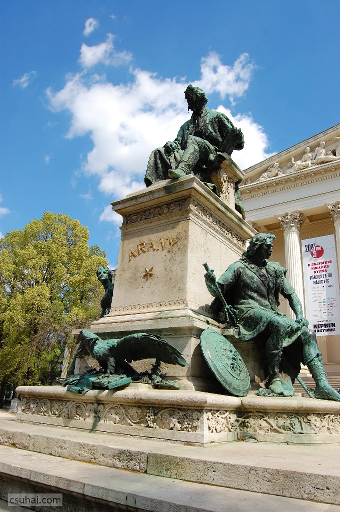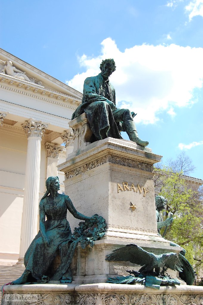 1817. március 2-án született Arany János, ma ünnepeljük születésének kétszázadik évfordulóját. Itt most mégsem költészetének vagy irodalmi munkásságának méltatása vagy mérlegelése következik, nem is idézetek csodálatos irodalmi megnyilvánulásaiból, hanem annak a demonstrálása egy gigantikus körbe-körbe keretében, amit itt a blogon is és más alkalommal is többször elmondtam már: Stróbl Alajos 1893-ban a Múzeum-kertben, a Nemzeti Múzeum épületének főhomlokzata előtt felállított szoborcsoportja a legkedvesebb szobrom. Nem azért, mert ez állna a legközelebb hozzám művészeteszményként, szobrászati korszakként, köztéri műalkotásként, nem is azért, mert ez lenne a legsikerültebb, a legszebb vagy legjobb szobor az összes közül; egyszerűen a legkedvesebb nekem, és a “legkedvesebbségnek” rengeteg eredője van — csak egyik része ennek, hogy számomra valamilyen módon a szobor tárgya, Arany János is a legkedvesebb. (Bár a jelzővel vigyázni kell, egyszer valaki figyelmeztetett, hogy nem biztos, hogy az illető dicséretnek veszi, ha kedves lánynak minősítem.) Stróbl 34 éves, mikor elnyeri a szobor megalkotására kiírt pályázatot, és 37, mikor a szobrot felavatják (Arany is még csak 76 lenne ekkor), a szoboregyüttes főalakja egy az egyben, a két mellékalak félig a hátát fordítja az avatáskor már több mint ötven éve álló múzeum főbejáratának. Arany János megérdemli ezt a helyet, sohasem moccant innen, és erre semmiféle ok nem is volt az elmúlt százhuszonnégy évben. Szóval látott ő már itt sok mindent. Sokszor fényképeztem az utóbbi években, ezekből a képekből jön most egy hosszú sorozat, és idővel, apránként majd fel fogom tölteni szöveggel is ezt a bejegyzést, Aranyról is, Aranytól is, Stróbl Alajosról is, ahogy az illik. De ma a “200” van.