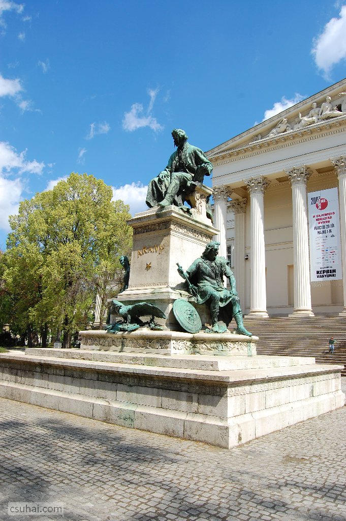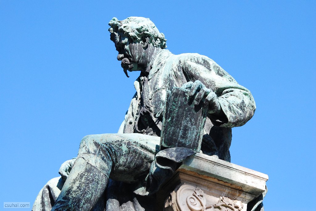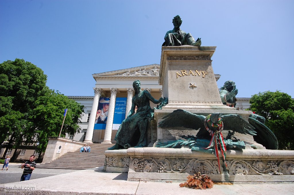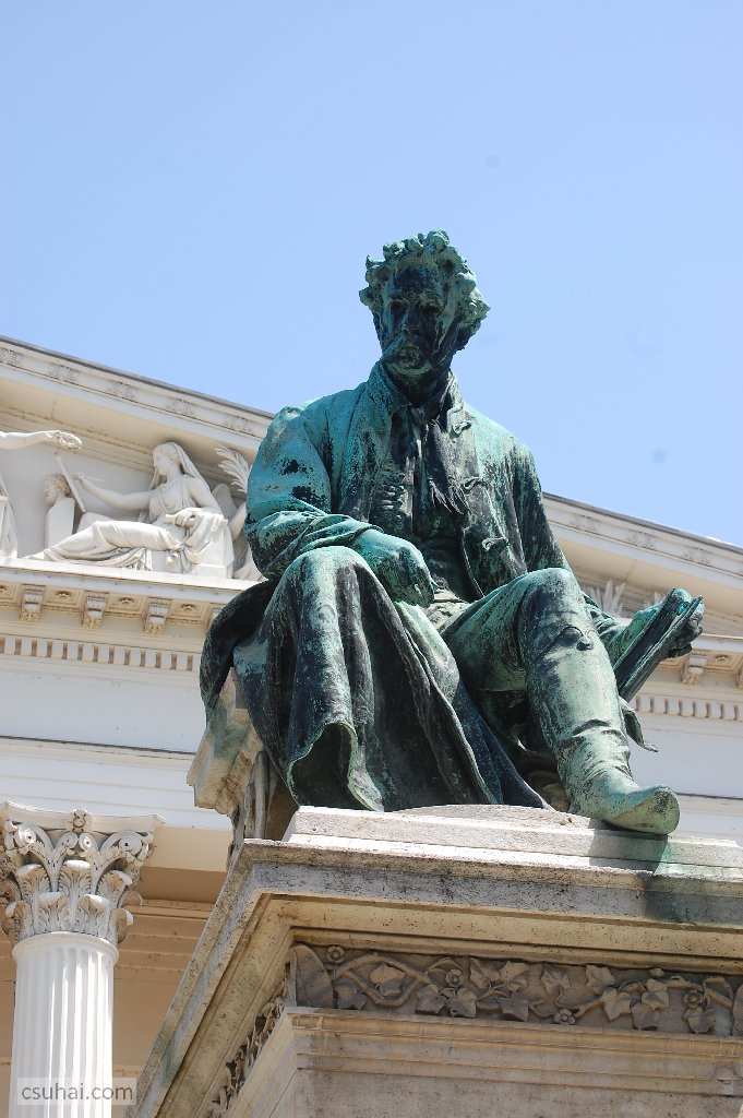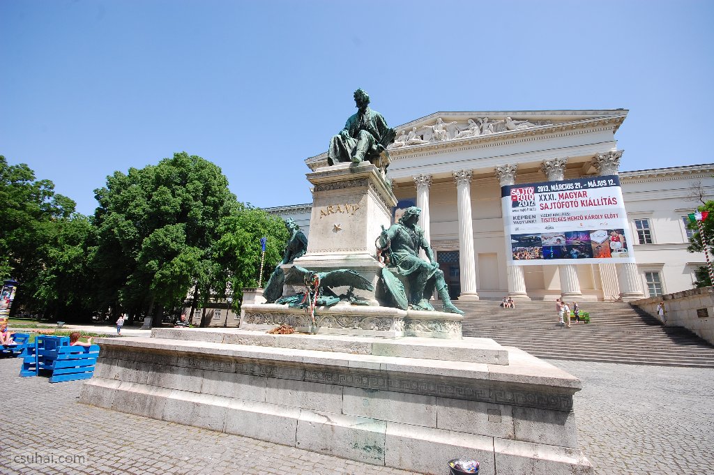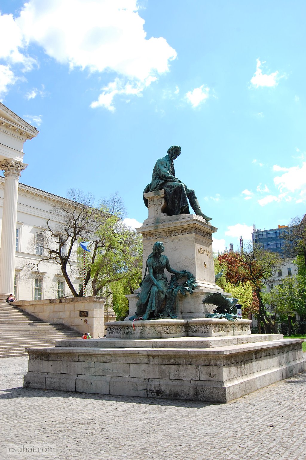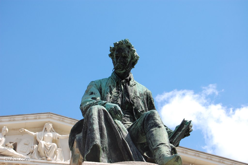 1817. március 2-án született Arany János, ma ünnepeljük születésének kétszázadik évfordulóját. Itt most mégsem költészetének vagy irodalmi munkásságának méltatása vagy mérlegelése következik, nem is idézetek csodálatos irodalmi megnyilvánulásaiból, hanem annak a demonstrálása egy gigantikus körbe-körbe keretében, amit itt a blogon is és más alkalommal is többször elmondtam már: Stróbl Alajos 1893-ban a Múzeum-kertben, a Nemzeti Múzeum épületének főhomlokzata előtt felállított szoborcsoportja a legkedvesebb szobrom. Nem azért, mert ez állna a legközelebb hozzám művészeteszményként, szobrászati korszakként, köztéri műalkotásként, nem is azért, mert ez lenne a legsikerültebb, a legszebb vagy legjobb szobor az összes közül; egyszerűen a legkedvesebb nekem, és a “legkedvesebbségnek” rengeteg eredője van — csak egyik része ennek, hogy számomra valamilyen módon a szobor tárgya, Arany János is a legkedvesebb. (Bár a jelzővel vigyázni kell, egyszer valaki figyelmeztetett, hogy nem biztos, hogy az illető dicséretnek veszi, ha kedves lánynak minősítem.) Stróbl 34 éves, mikor elnyeri a szobor megalkotására kiírt pályázatot, és 37, mikor a szobrot felavatják (Arany is még csak 76 lenne ekkor), a szoboregyüttes főalakja egy az egyben, a két mellékalak félig a hátát fordítja az avatáskor már több mint ötven éve álló múzeum főbejáratának. Arany János megérdemli ezt a helyet, sohasem moccant innen, és erre semmiféle ok nem is volt az elmúlt százhuszonnégy évben. Szóval látott ő már itt sok mindent. Sokszor fényképeztem az utóbbi években, ezekből a képekből jön most egy hosszú sorozat, és idővel, apránként majd fel fogom tölteni szöveggel is ezt a bejegyzést, Aranyról is, Aranytól is, Stróbl Alajosról is, ahogy az illik. De ma a “200” van.