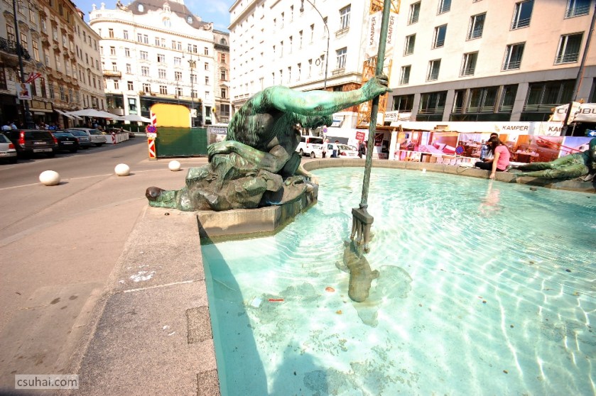 A hivatkozással nem jelölt halas szobor Anton Dominik von Fernkorn Dunaboszorkányok-kútjának részlete, a bécsi Herrengasse és a Freyung között 1856-60 között épített Ferstel-palota átriumából; a Ferstel-palota egykor az Osztrák-Magyar Bank bécsi épületeként szolgált.