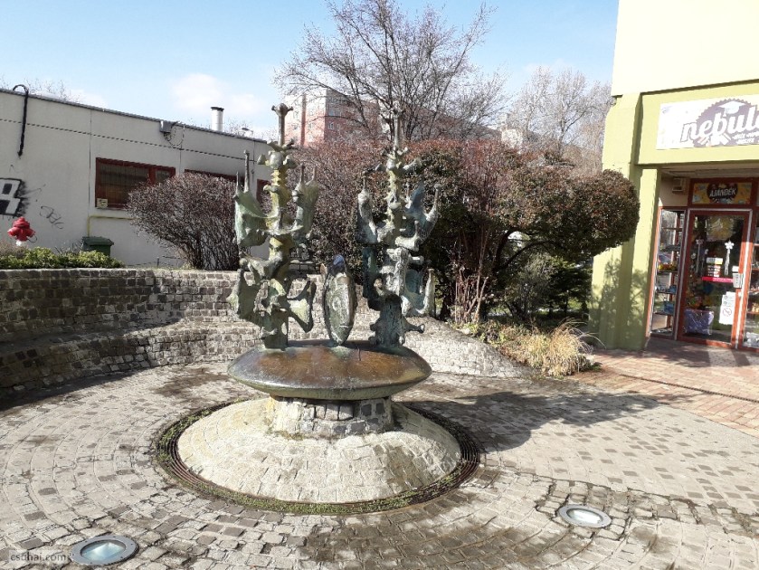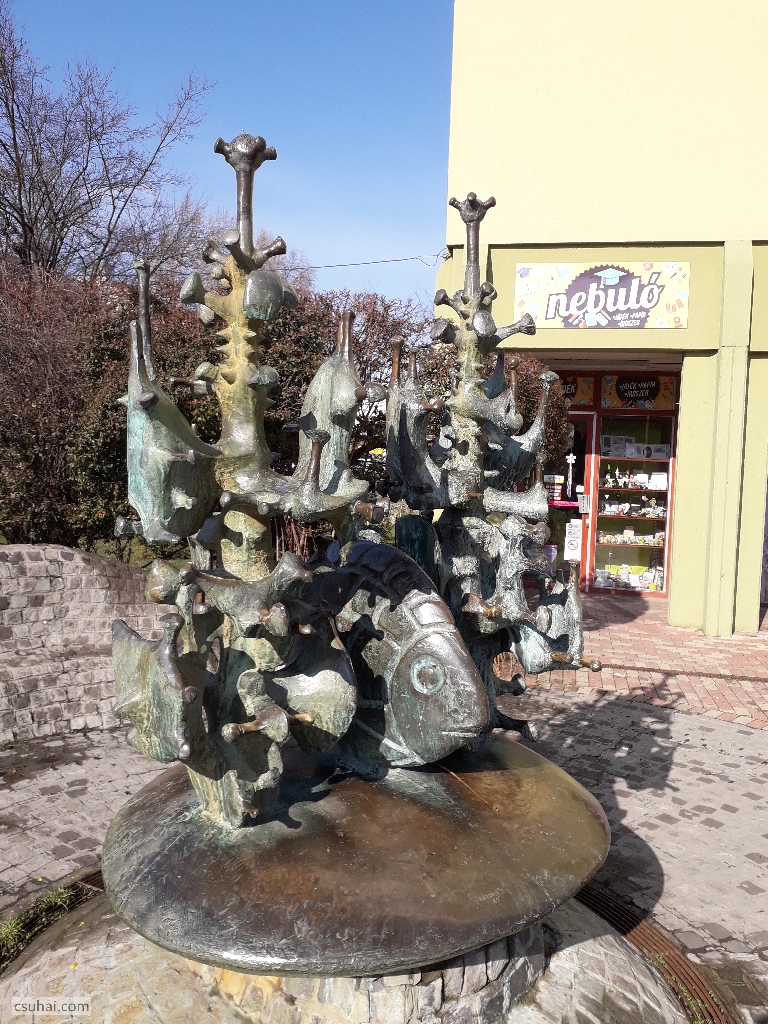 Itt kénytelen voltam utólag beszúrni egy részt a posztba, mert én is később szereztem róla tudomást, viszont megkerülhetetlen a tény. A három szobrász közül az egyik, Rátonyi József köztéren igen rutinos halas. Békásmegyer sétálóutcává átalakított központjában áll