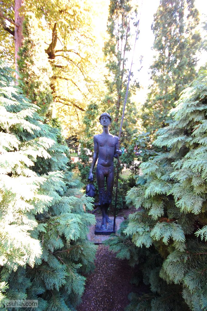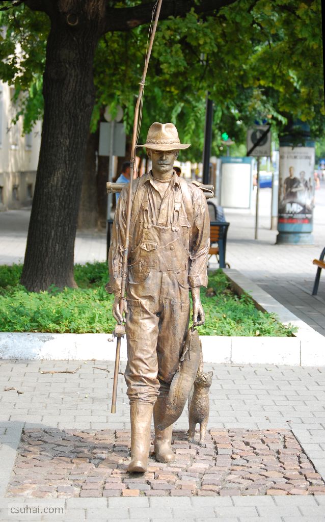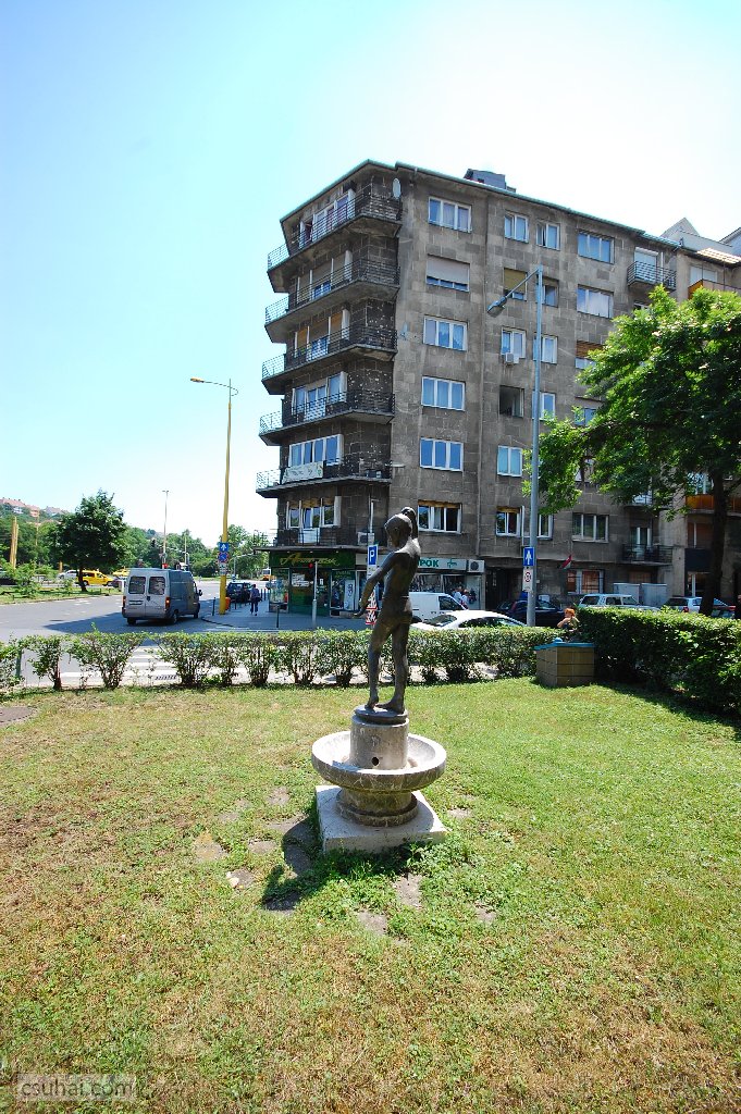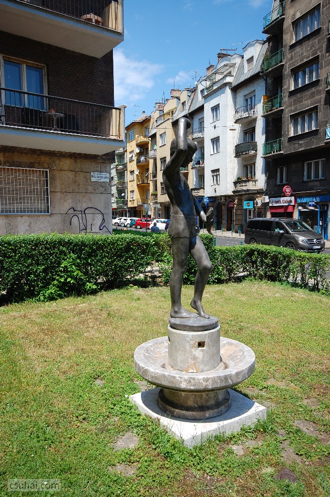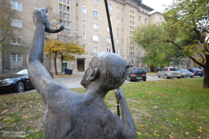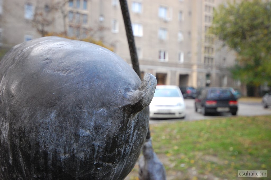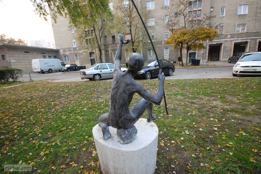 (egyik kezében ott a zsákmány, a másikban benne a horgászbot), mégis túlságosan kilóg nekem a korból, kilóg a sorból is, és végül eléggé el nem ítélhető módon csak a cicókát használtam fel belőle nemrégiben, a Cheshire-i macska egyik megtestesüléseként. Ám miközben a régi képeimet nézegettem, eszembe jutott, hogy hiszen ott van Budán, a Kék Golyó és a Városmajor utcák sarkán lévő kis téren egyik kedvenc, sokszor és szívesen fényképezett darabom, Laborcz Ferenc szobra,