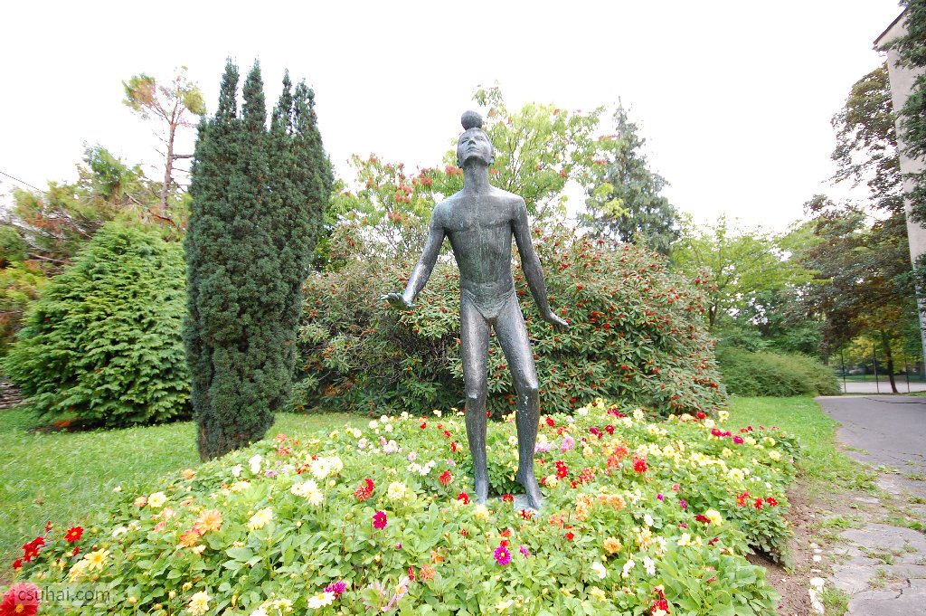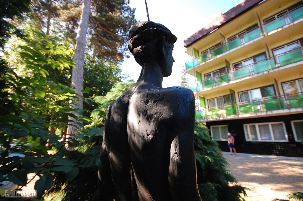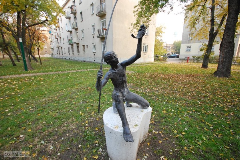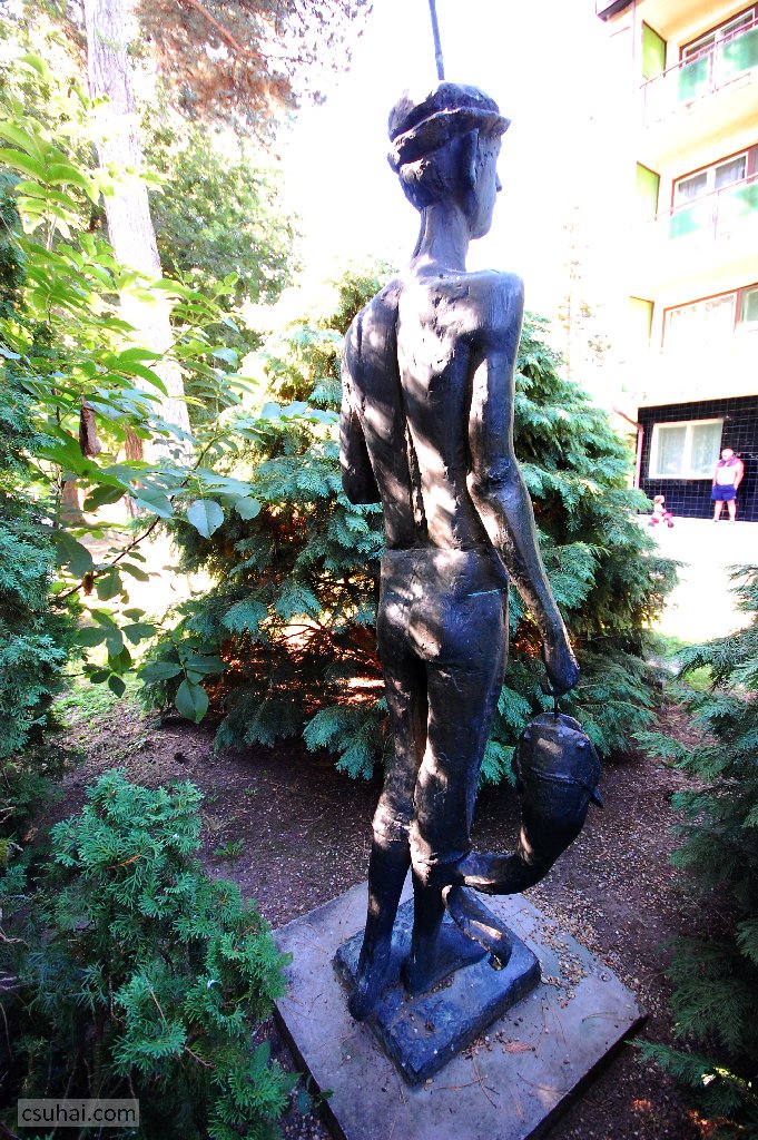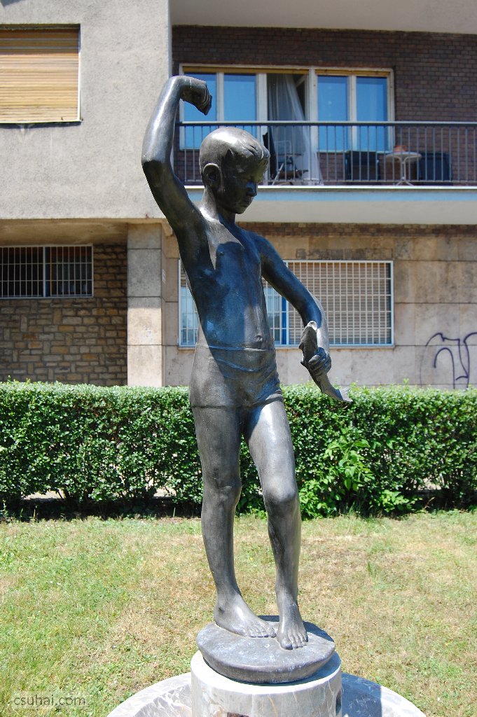 Így jutunk el (itt legalábbis) e bejegyzés harmadik szobrához, Rátonyi József a másik kettőnél úgy bő évtizeddel későbbi, 1973-ban Balatonlellén felállított Horgászfiújához. Ehhez a szoborhoz kedves, klasszikus szoborvadász-élményeim fűződnek, a Köztérképen egy darabig helytelenül volt betájolva, és hiába laktam talán száz méterre tőle egy héten át 2015 késő nyarán, rengeteg kalandomba került, sok újat, számomra addig ismeretlent láttam a világból, mire megtaláltam az egyik lellei üdülő kertjében.