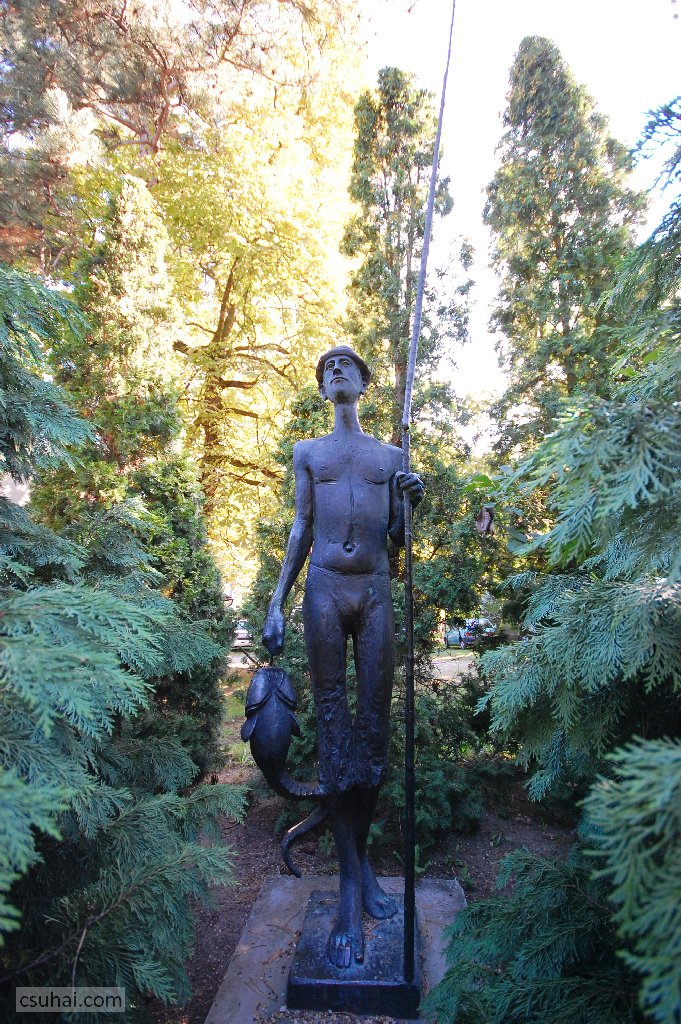 maga a zsákmány, a horgász- vagy halas szobor megkerülhetetlen eleme is persze — a hal megvan már,