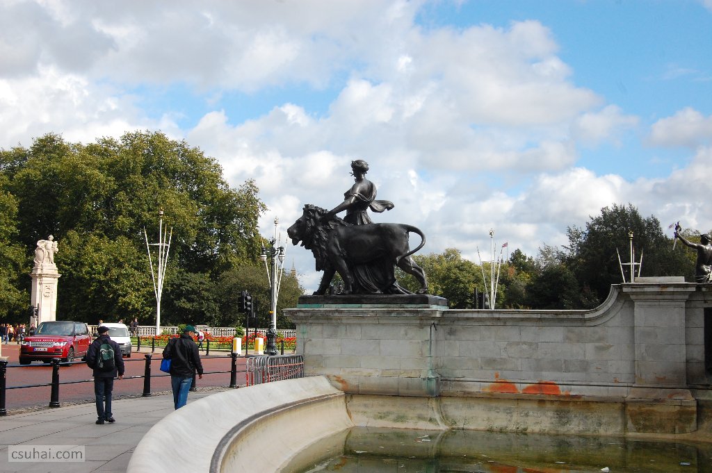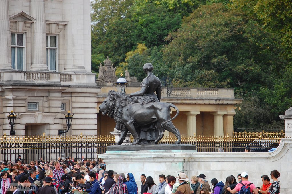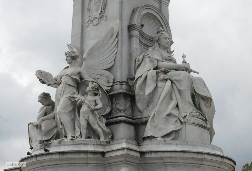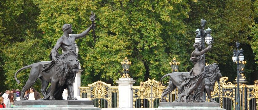 Megtehetném, hogy ezeket a képeket egyszerűen beleteszem abba a posztba, hiszen a Buckingham Palota előtti Victoria Emlékműről nem akarok olyan részletes bemutatást írni, mint amilyet a királynő fiatalon elhunyt férje, Albert herceg Kensington Gardens-beli emlékművéről a múltkor írtam. De jobb ez így, újra az elejéről kezdve. Nagyjából különben negyven év van a két emlékmű között, ami a két halálesetet, a nemes elhatározást, a pénzgyűjtést, a pályázatot és a megbízást illeti, az előbbi szoboregyüttes kivitelezésének elhúzódása miatt ez az időtáv később csökkent valamelyest, így vehetett részt a Viktória Emlékmű szobrásza, Thomas Brock (1847–1922) az aranyszínű Albert-szobor végső munkálataiban az azt a szobrot mintázó John Henry Foley (1818–1874) idő előtti betegsége és halála miatt, és noha 1911-ben a Victoria Memorial egy nagyobb városrendezési projekt, a The Mall mai kiképzése keretében került nagyon exponált helyére, közvetlenül a Buckingham Palota a belváros felé néző főhomlokzata és előkertje elé, egészében és részleteiben, még ha méretesebb is, kevésbé pompázatos szobrászati dolog, mint a jelentéstanilag közvetlen elődjének tekinthető, George Gilbert Scott megálmodta Albert Memorial. (Az egész itteni projekt fő építésze Sir Aston Webb volt.) Az emlékállítás