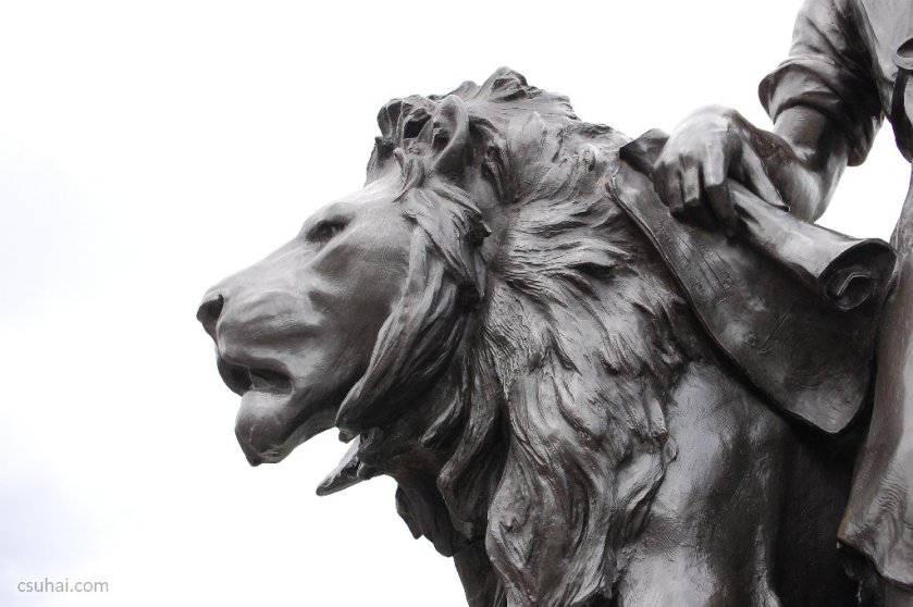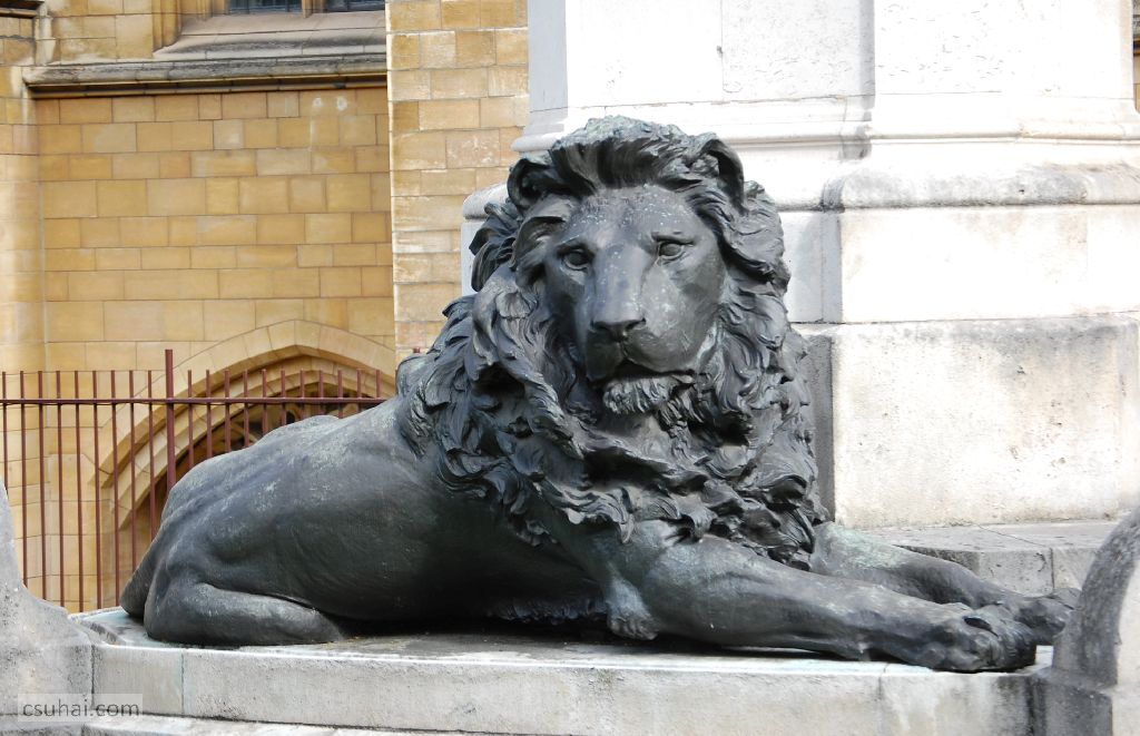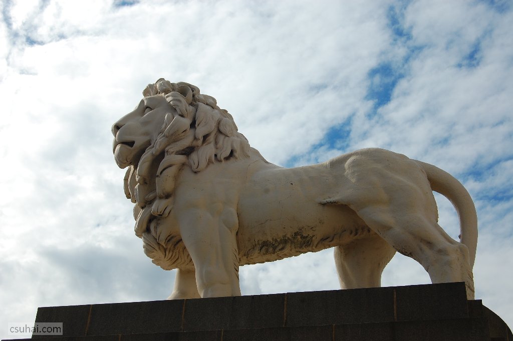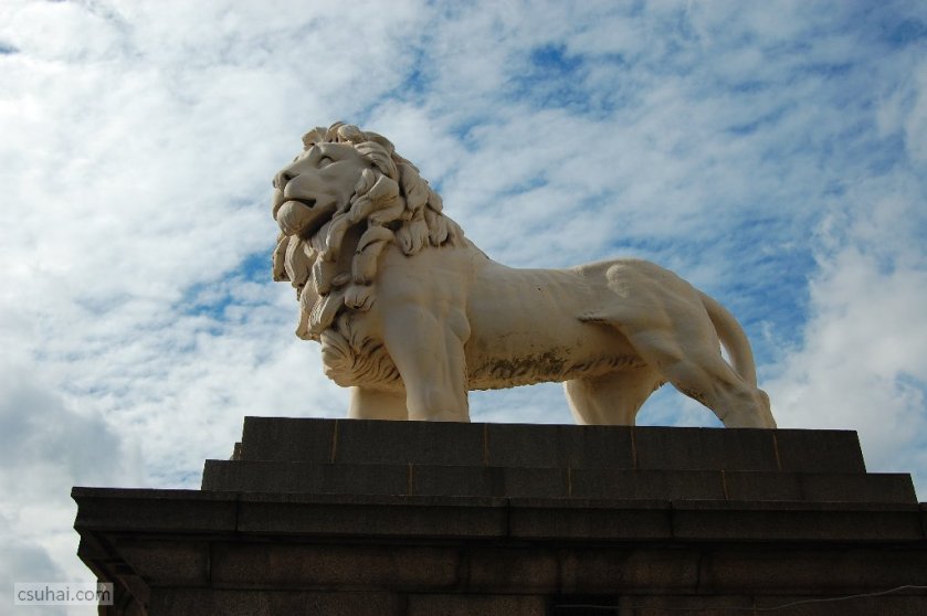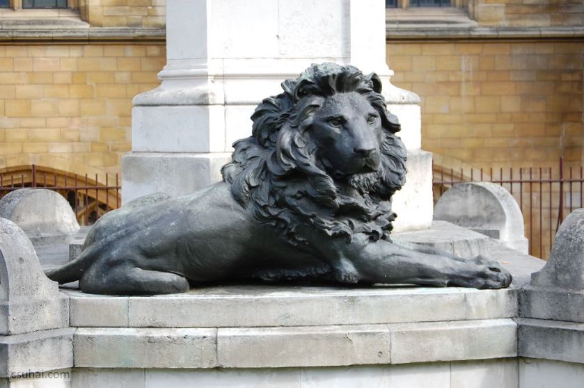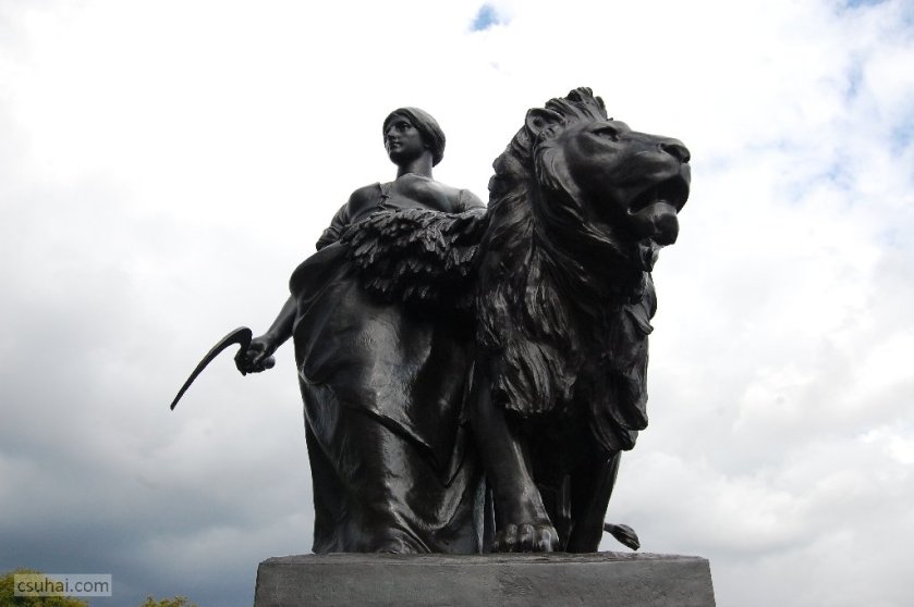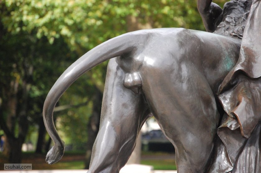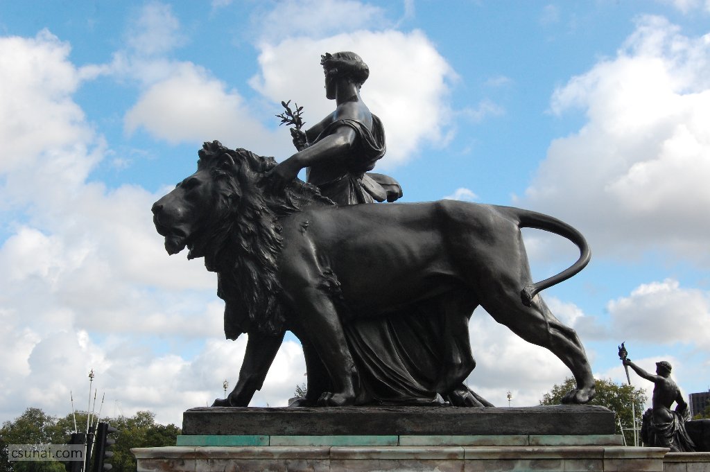 de engem ezúttal a megfáradt koronás öregasszony ugyanúgy nem foglalkoztat, mint a vele egy szinten helyet foglaló, a főpilont körbeölelő többi márvány-allegória, vagy az emlékmű tetején ott lévő, aranyozott Szárnyas Niké, még a lejjebb lévő bronz vízi lények sem — most kizárólag a kör alakú emlékmű négy szimmetrikus pontján ott álló bronz oroszlánnal szeretnék törődni.