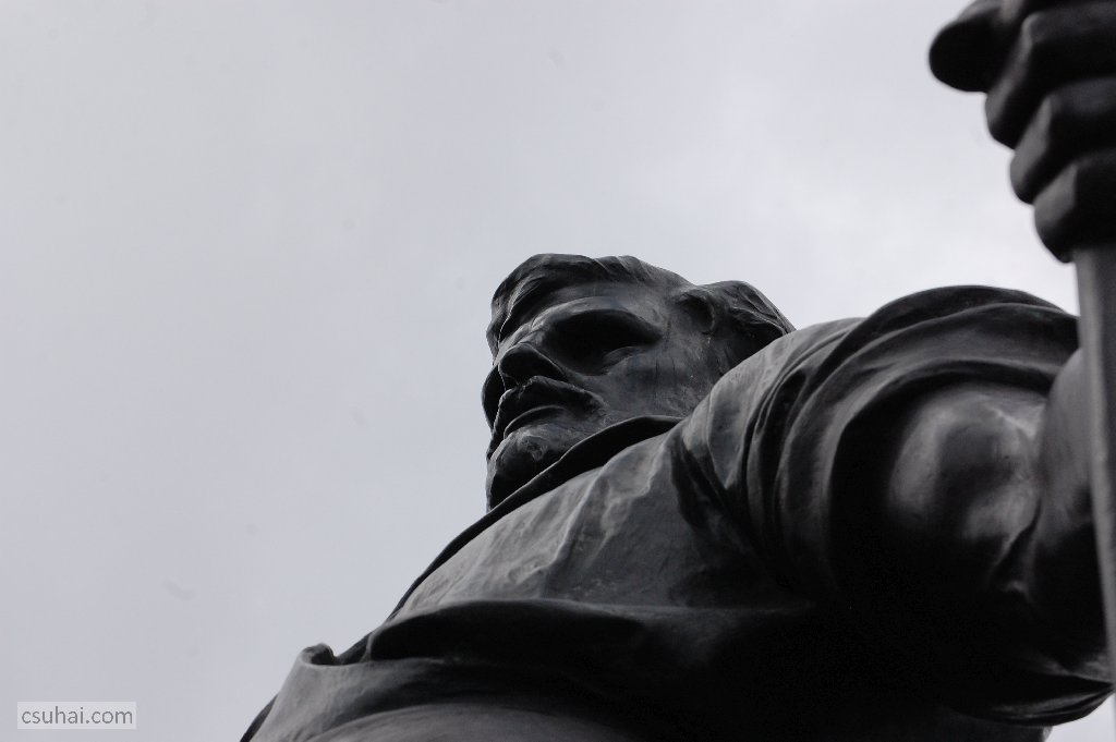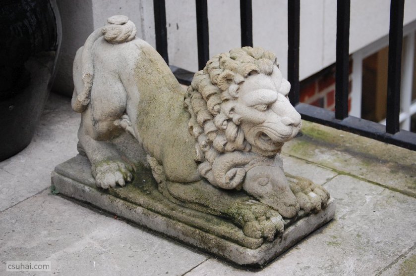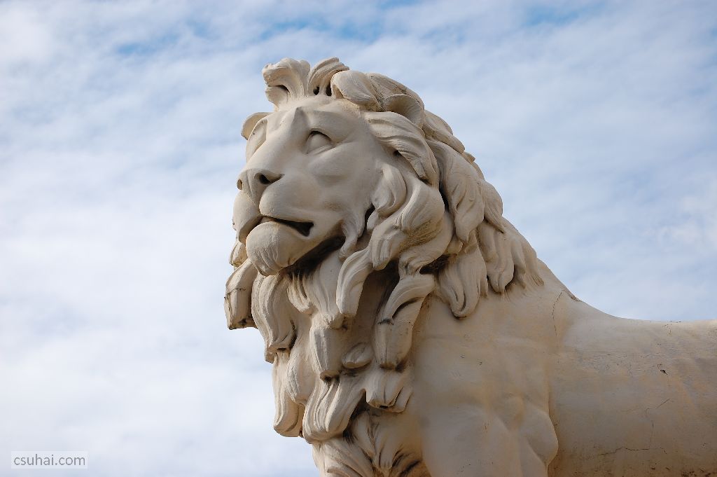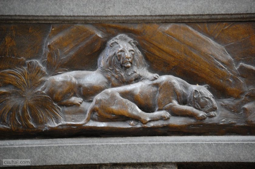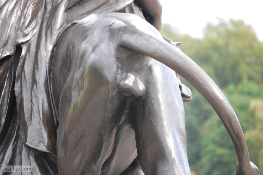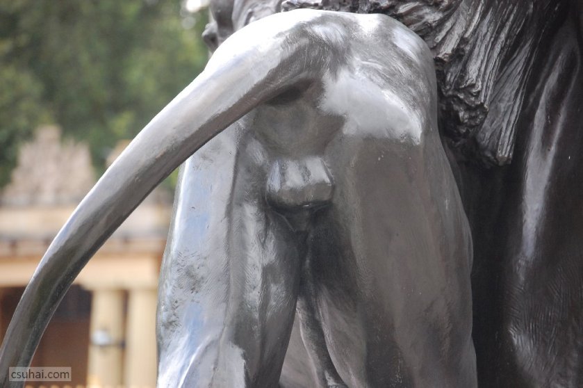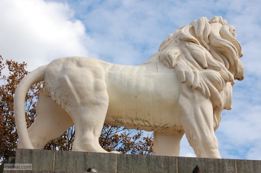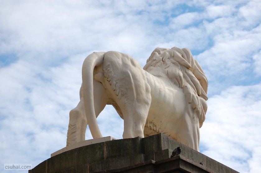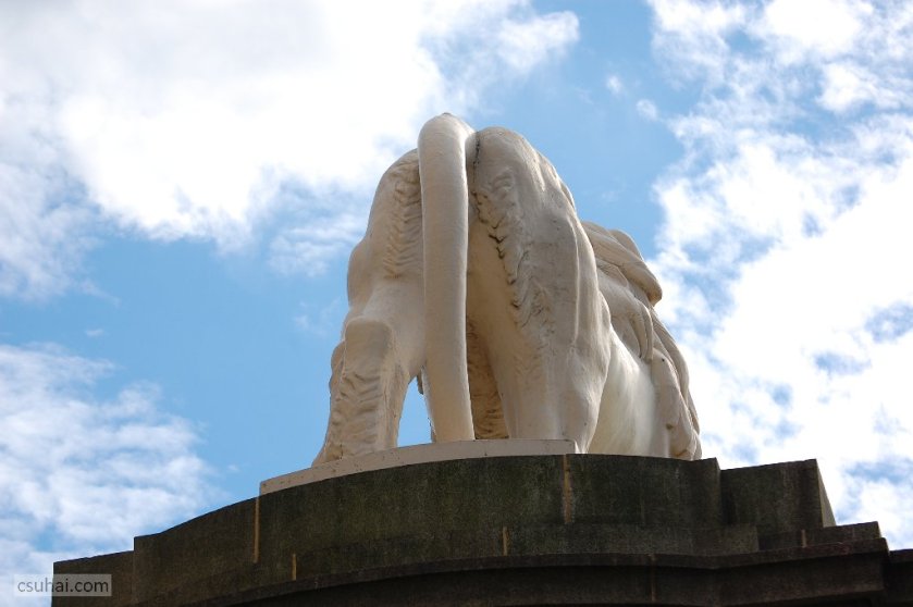 de engem ezúttal a megfáradt koronás öregasszony ugyanúgy nem foglalkoztat, mint a vele egy szinten helyet foglaló, a főpilont körbeölelő többi márvány-allegória, vagy az emlékmű tetején ott lévő, aranyozott Szárnyas Niké, még a lejjebb lévő bronz vízi lények sem — most kizárólag a kör alakú emlékmű négy szimmetrikus pontján ott álló bronz oroszlánnal szeretnék törődni.