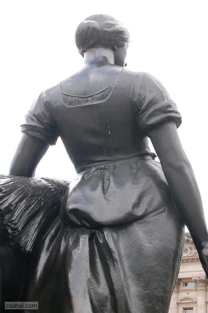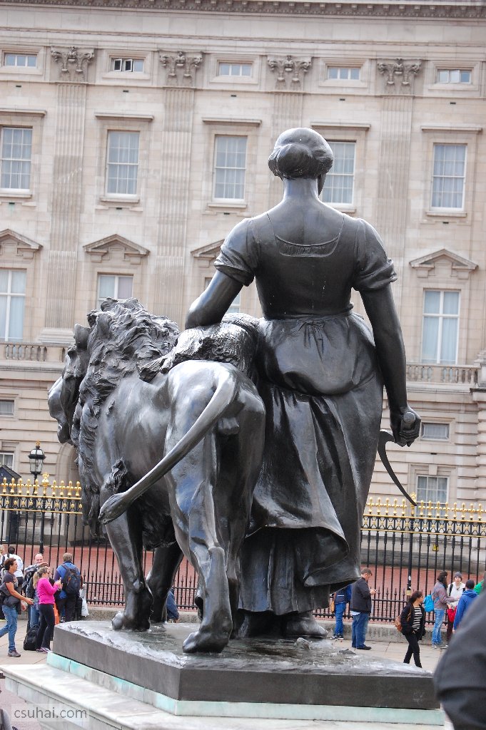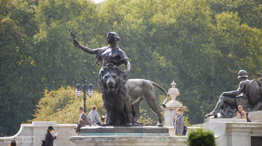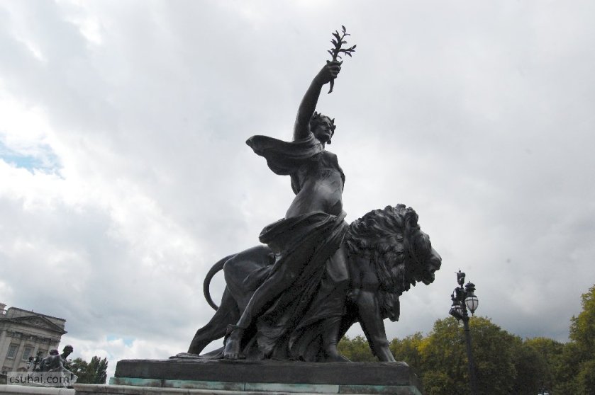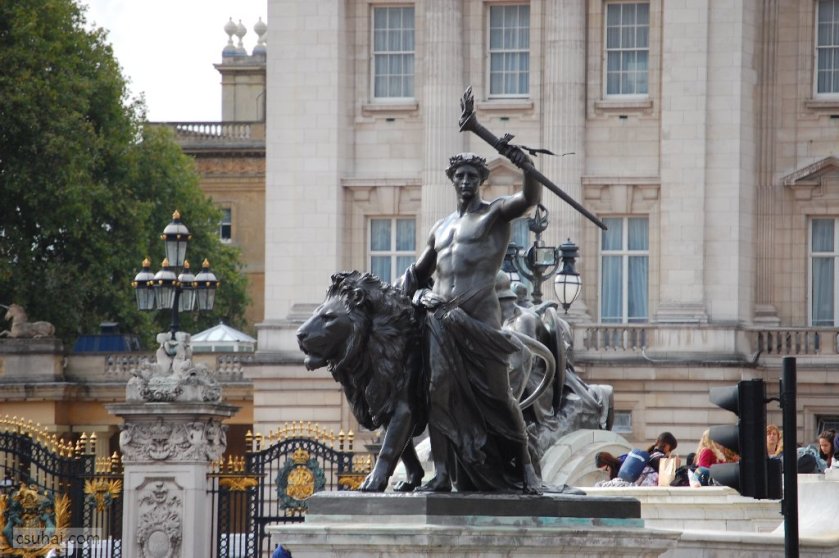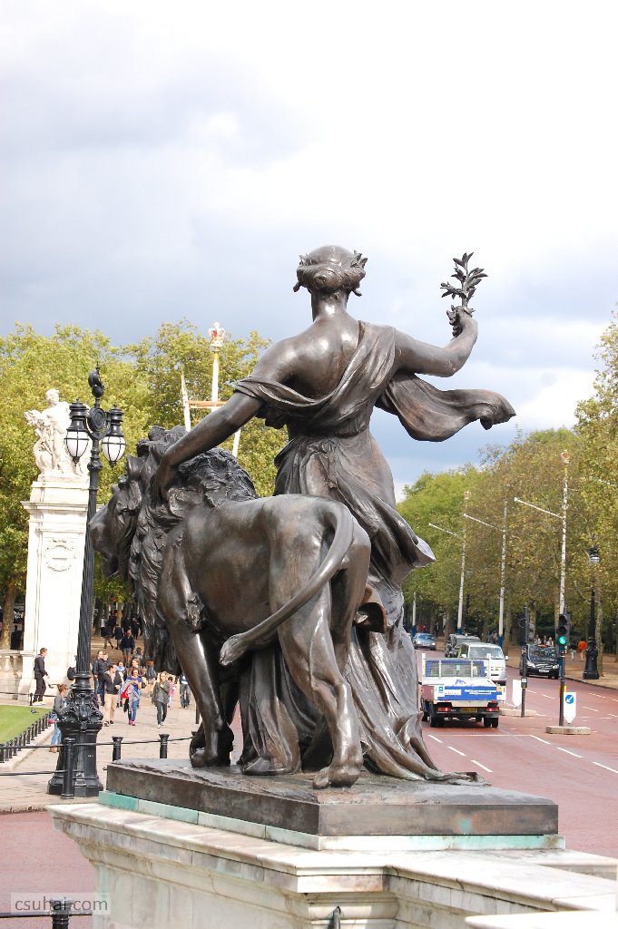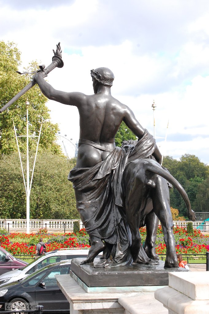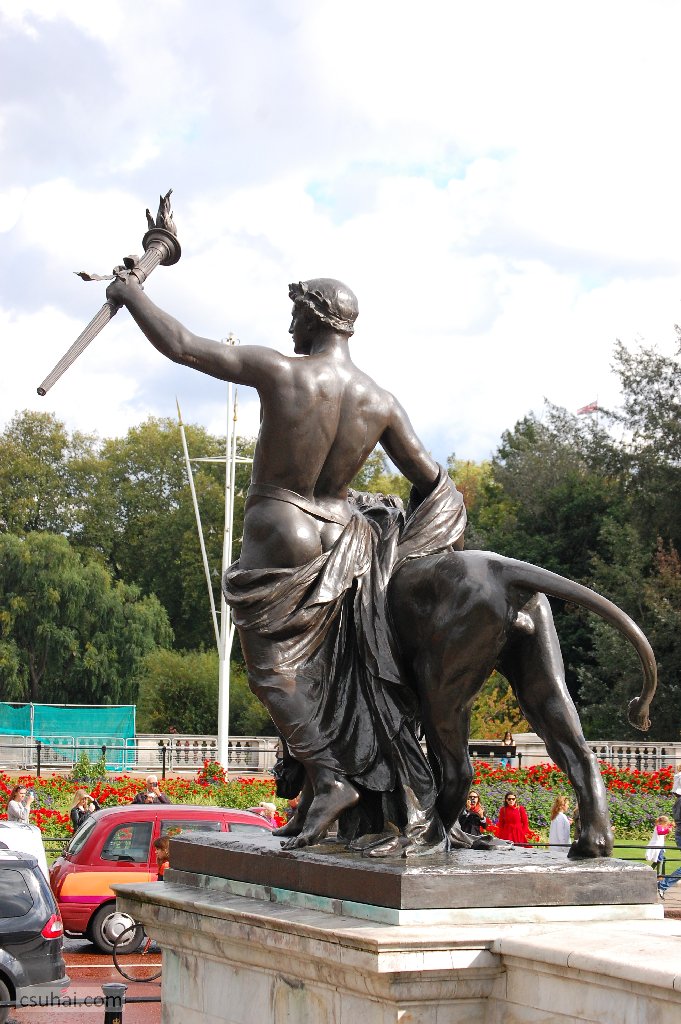 Neki háttal, már a Buckingham Palota felé fordítva a két profán allegória közül a jobb oldalra eső,