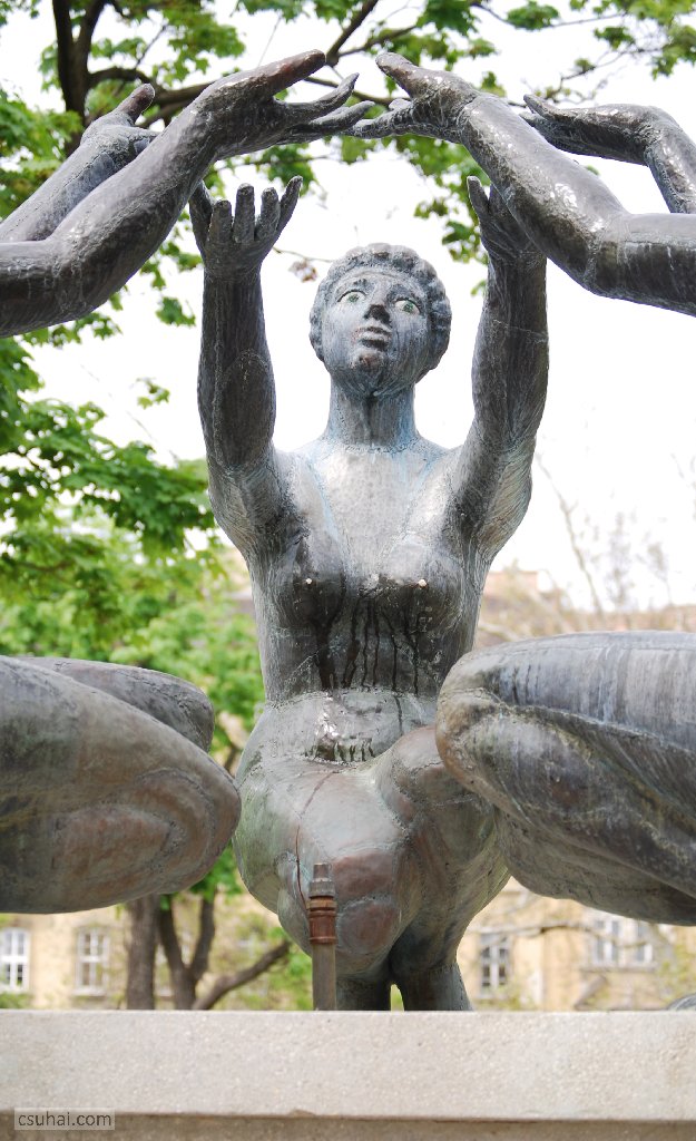 ott lévő csőből függőlegesen fölfelé zúdul a víz, ami a kezek vonala fölött a gravitációnak engedve azután visszafele hullik. Az előző három képen mindig más-más nőt helyeztem a három közül a felvétel középpontjába, ebből pontosan látható nemcsak a csoport jellegzetes szimmetriája, hanem az egyes alakok azonossága is,