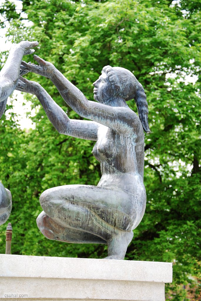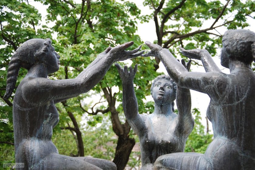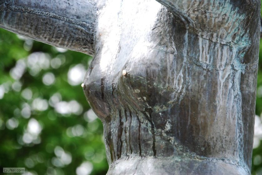 melyek itt úgyszólván anatómiailag tagolják a szemünk előtt guggoló alakokat (hogy ez a két, a park belsejéhez legközelebb lévő nőn előkerülő mellbimbó, az egyetlen számottevő és szemmel látható különbség a három megformálás között a szobor eredeti vonása vagy pedig a tisztelt közönség utólagos beavatkozása-e, régebbi képek híján nem igazán tudtam eldönteni; az egyébként felöltöztetett lányok egyikét valaki édes szerelemgépnek vélhette, amin elég megnyomni egy ráapplikált gombot, és már érkezik is a szerelem),