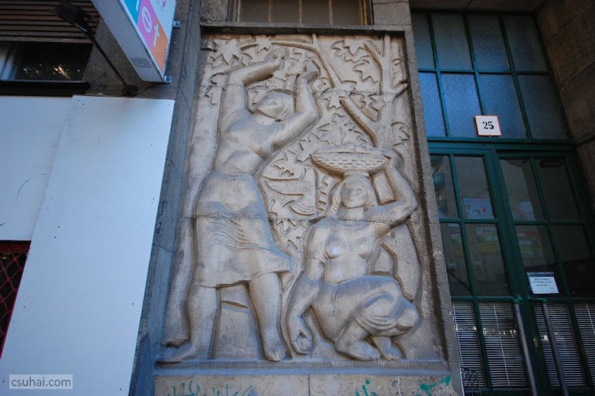 25 Azonosítatlan szobrász Gyümölcsszedő nők című díszítő reliefje (Budapest, Lövőház utca, 1941)
