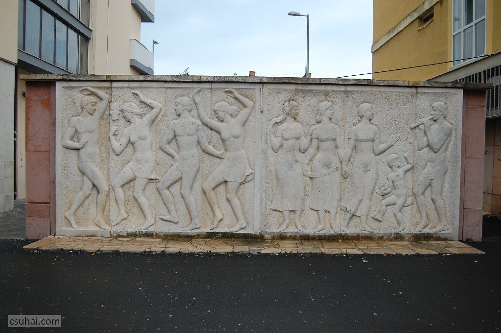 8 Lesenyei Márta: Tavasz (egy ötdarabos relief-sorozat nyitó része, Pécs, Uránváros, 1959)