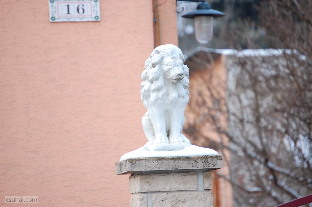 16 Hóval borított sorozatgyártásos díszítő oroszlán Újpesten, a Blaha Lujza utcában