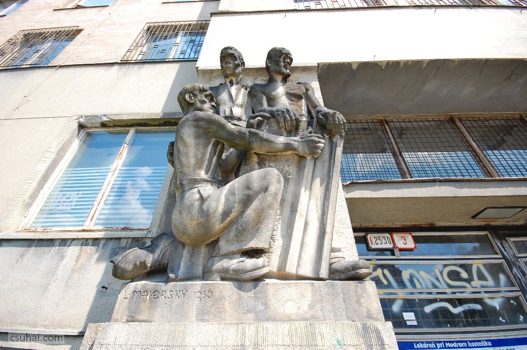 3 Ladislav Majerský háromalakos kompozíciója a Bezrucova utcai, a fényképezés idején elhagyott és lepusztult egykori kórházépület bejáratánál, szemben a Lechner Ödön-féle “Kék” Szent Erzsébet-templommal, Pozsony, 1936