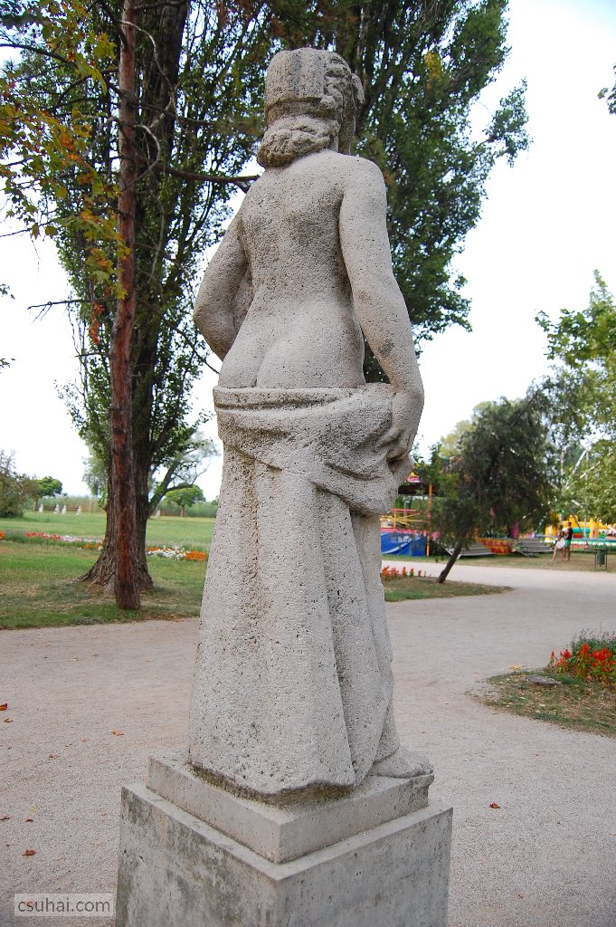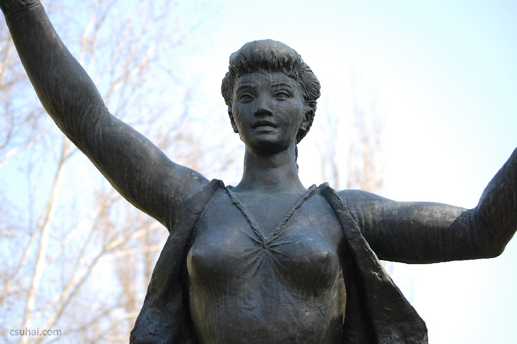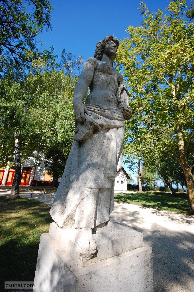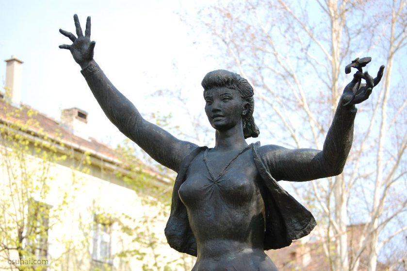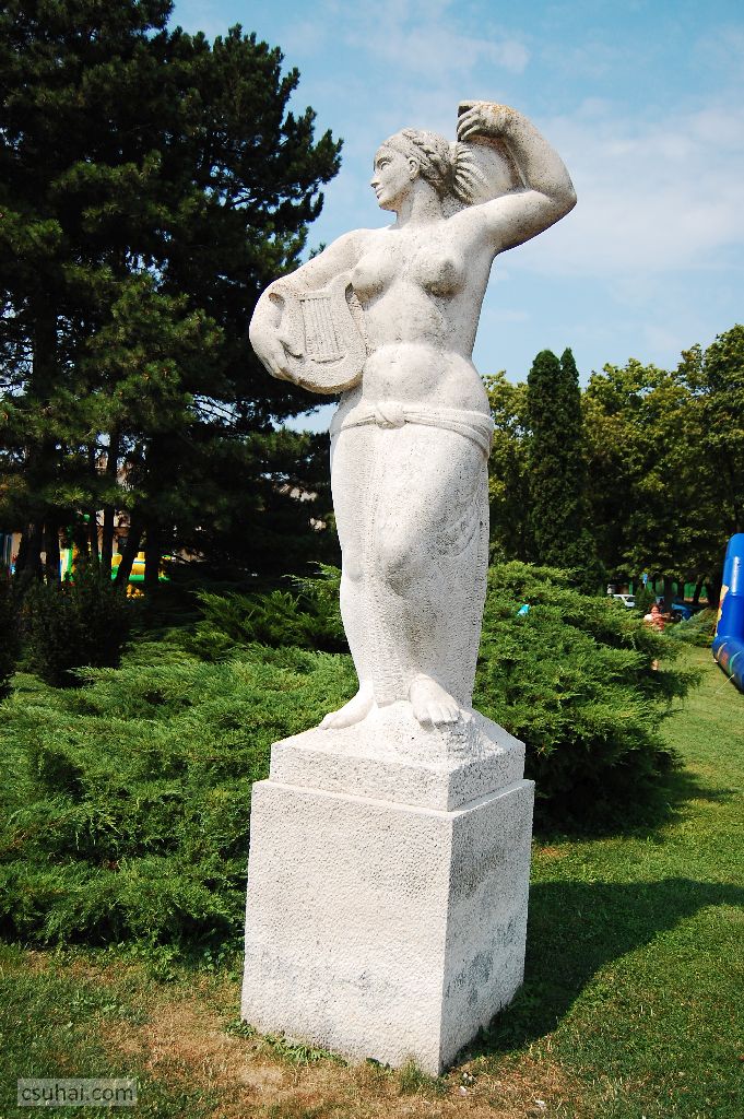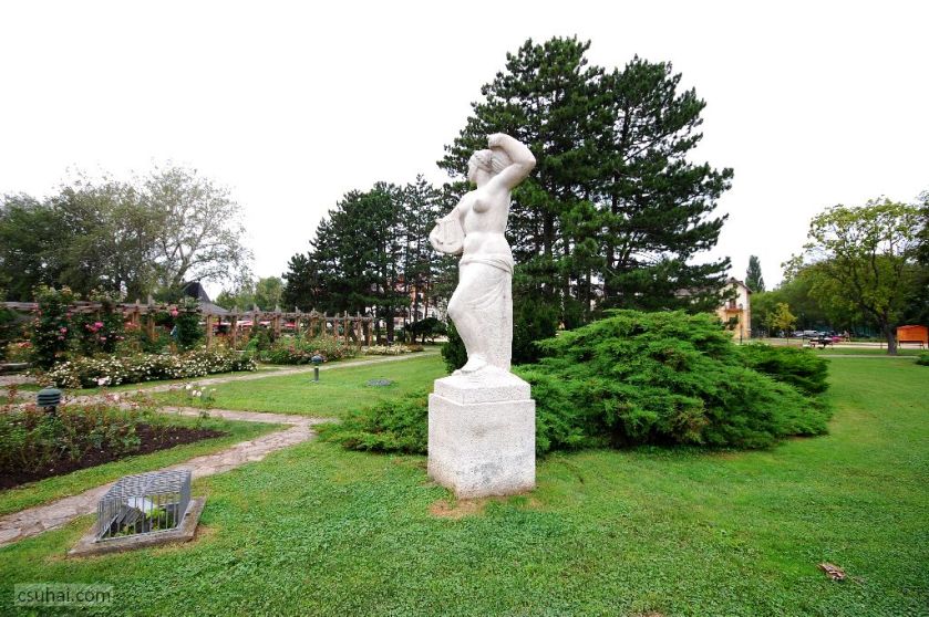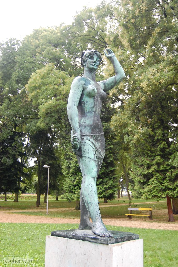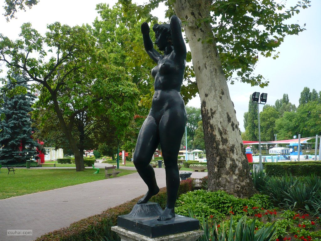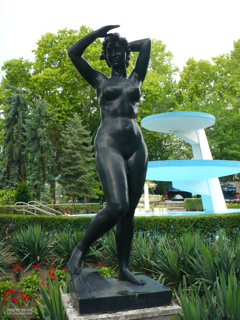 és közelebbről jól láthatóan felöltöztetett, idomait egy pillanatra sem rejtegető, 1961-ben felállított, harsányabb, keleties arckifejezésű bronz nőalakot — ebbe a sorba illeszkedik majd az alább részletesen szóba kerülő, Keszthelyen álló Helikon is.