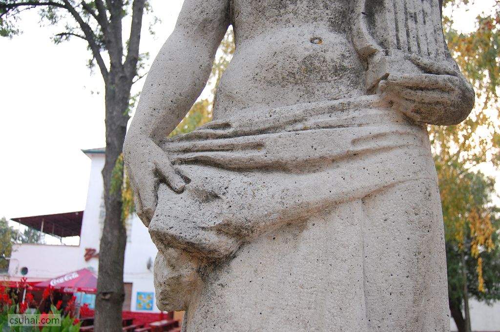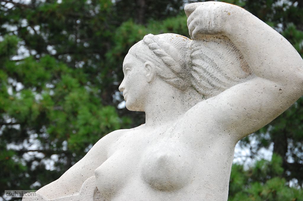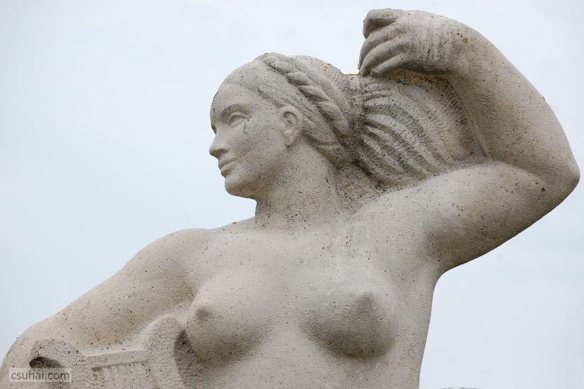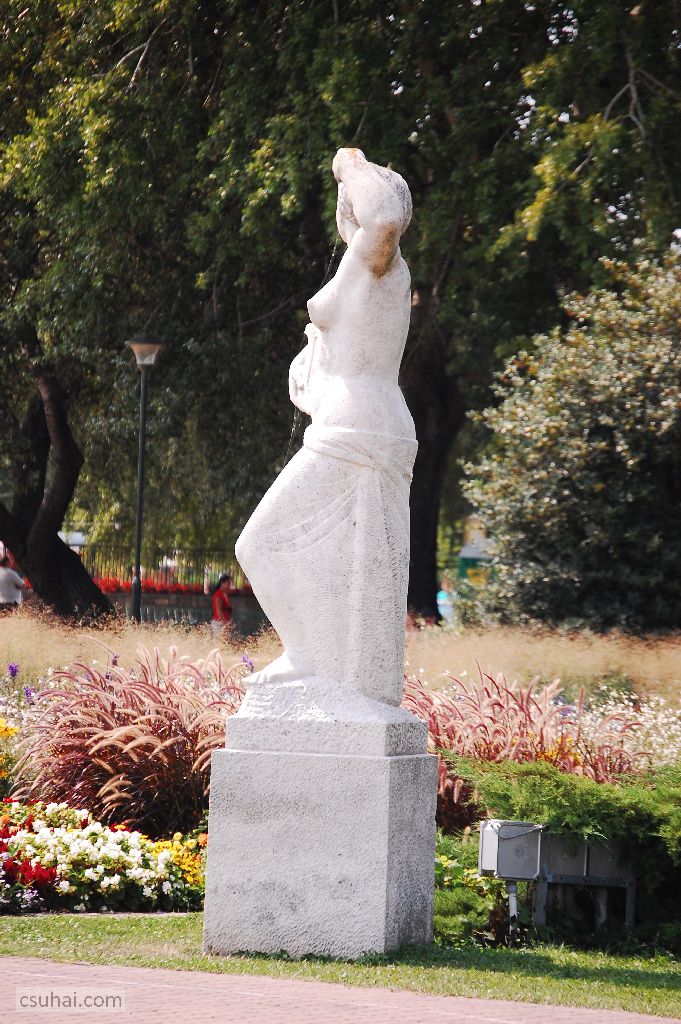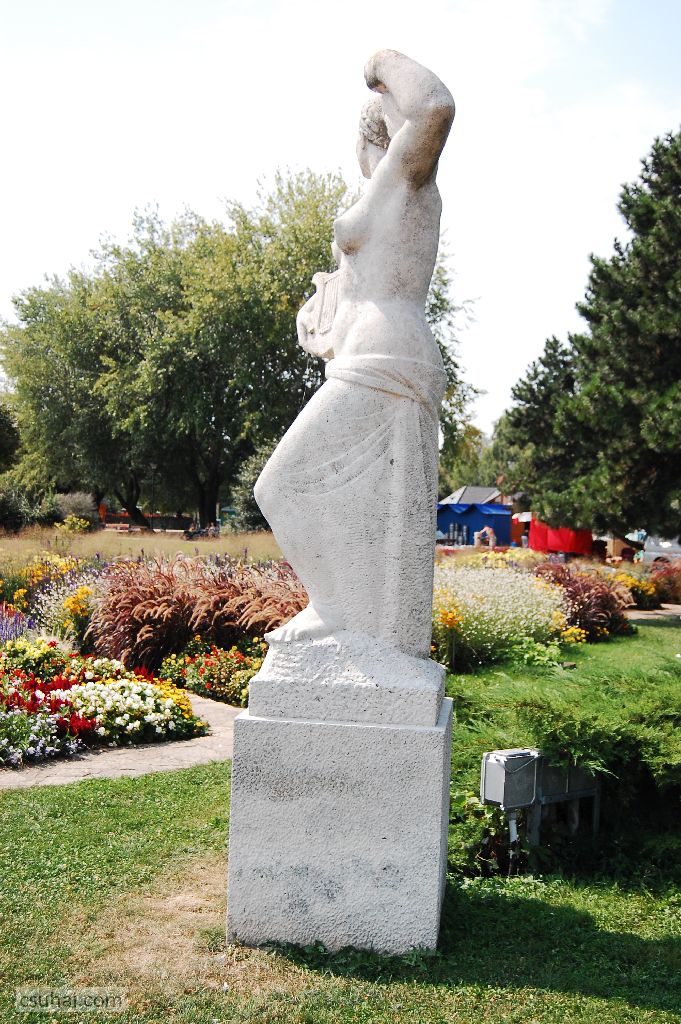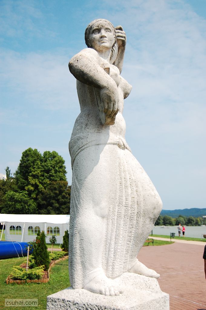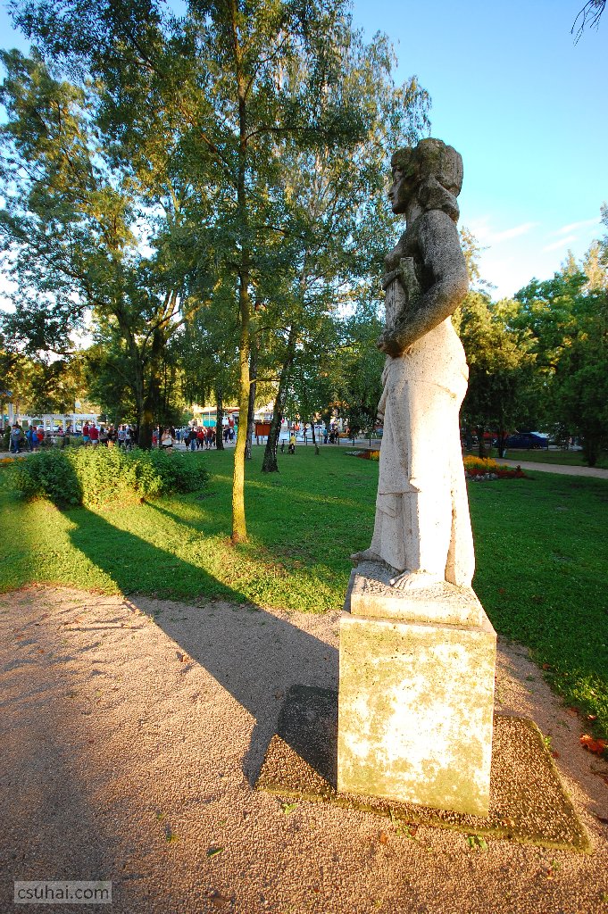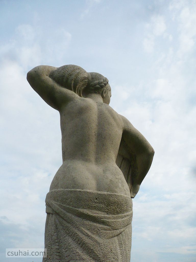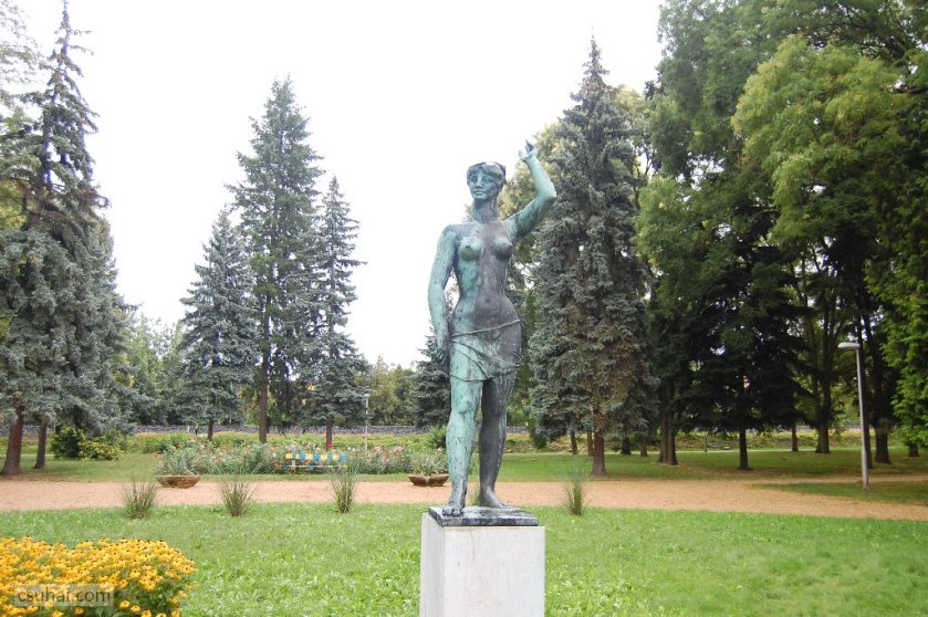 és közelebbről jól láthatóan felöltöztetett, idomait egy pillanatra sem rejtegető, 1961-ben felállított, harsányabb, keleties arckifejezésű bronz nőalakot — ebbe a sorba illeszkedik majd az alább részletesen szóba kerülő, Keszthelyen álló Helikon is.